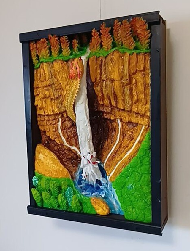 商品は、栃木県日光市大谷川の「華厳の滝の登竜門」の立体絵画。 華厳の滝は、高さ97m、幅7mで、男体山の噴火で塞き止められた中禅寺湖からの流出口に位置。華厳の滝は中禅寺湖に至る登竜門です。 作品は、華厳の滝つぼに辿り着いた鯉が滝を昇ろうとし、成功した鯉が竜になる故事を描いた登竜門の絵画。滝つぼには複数の鯉たち、ついに難関を突破して滝を巻いて昇る竜。滝の瀑布と昇竜の勢いを描いてます。 中禅寺湖には竜が島に化し、竜の形をした八丁出島があり(最後の写真参考)、竜はそこを目指して竜神となります。どんな難関も叶う絵画です。 この絵画の動画は「zensaku66」をネットで検索→1段目のinstagramの [zensaku66] をクイック→本作品の画像をクイック、して動画をご覧下さい(スピーカーを開くと音楽が流ます)。 耐久性に優れた樹脂粘土を材料に整形研磨し、硬化と光沢の表面加工剤等で装飾した、未来3D粘土アートの立体絵画。 作は山川工房の山川善作(裏に印)。立体奥行10cm、縦横30×40cm、重さ約1kg。