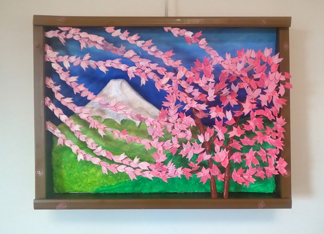 桜吹雪とは、満開になった桜の花が吹雪のように一斉に乱れ散りゆく様子。綺麗な桜のはかない情景です。 富士山は古来より信仰の対象や芸術の巨像、日本の永遠の象徴。桜も富士も、日本人の心の拠り所になってます。 作品は富士を背景に、桜の木から花びらが風に吹かれて舞う様子。つむじ風で一つ一つの花びらが同じ筋に沿って巻いて散ってます。咲いたばかりのまだ枯れてない花びら、遠方の雪富士に見送られながら、綺麗に鮮やかに雪吹雪のように散っていきます。 この絵画の動画は「zensaku33」をネットで検索→1段目のinstagramの [zensaku33] をクイック→本作品の画像をクイック、して動画をご覧下さい(スピーカーを開くと音楽が流れます)。 耐久性に優れた樹脂粘土を材料に整形研磨し、硬化と光沢の表面加工剤等で装飾した、未来3D粘土アートの立体絵画。 立体奥行8cm、縦横30×40cm、重さ約1kg。作は山川工房の山川善作(裏に印)。