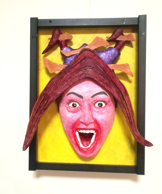 笑うことは、脳内血流が良くなり、不安やストレスを軽減するドーパミンや、幸福ホルモン、愛情ホルモンも分泌。前向きに挑戦する気持ちや心身がリラックスする効果があります。 作品は、あなたのめっ茶可笑しい話に、驚き喜んで口を開いて笑い出してる女性。 茶髪を垂らしべっ甲色の「一の字」簪(かんざし)を刺して、「三日月」簪で紫色の頭巾(ずきん)を留めて、頭巾から出てる両方の髪を折って「結び」簪で結んでる、粋な新日本髪です。 髪と簪の配置が『笑』の字に見えませんか?(最後の写真参考)。笑い出す顔を見ると、福が来そうです。 この絵画の動画は「zensaku88」をネットで検索→1段目のinstagramの [zensaku88] をクイック→本作品の画像をクイック、して動画をご覧下さい(スピーカーを開くと音楽が流れます)。 耐久性に優れた樹脂粘土を材料に整形研磨し、硬化と光沢の表面加工剤等で装飾した、未来3D粘土アートの立体絵画。 作は山川善作の山川工房(裏に印)。立体奥行9cm、縦横30×40cm、重さ約1kg。