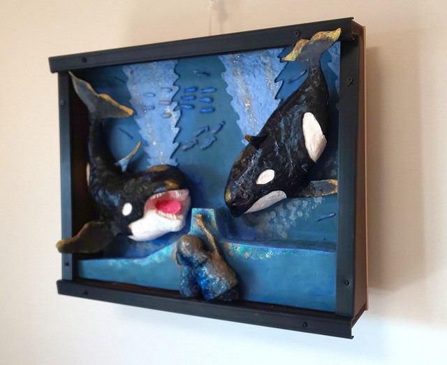 シャチは知能が非常に高く、攻撃性も高く、最強の哺乳動物で天敵はいない海のギャングといわれていますが、人間を襲うことはほとんどありません。性格は好奇心があり人間とじゃれたりもします。 透明度や強度が優れたアクリルガラスが使用されると大型化され、大型のシャチも水族館で展示されるように。 作品は、来館者の親子がシャチを仲良く鑑賞。初めて見るシャチに怖さもなく楽しげな親子に、じゃれて反応する2匹のシャチ。周りの魚に仲間意識が生まれ、みんな自由に楽しく泳いでます。 この絵画の動画は「zensaku22」をネットで検索→1段目のinstagramの [zensaku22] をクイック→本作品の画像をクイック、して動画をご覧下さい(スピーカーを開くと音楽が流れます)。 耐久性に優れた樹脂粘土を材料に整形研磨し、硬化と光沢の表面加工剤等で装飾した、未来3D粘土アートの立体絵画。 作は山川工房の山川善作(裏に印)。立体奥行10cm、縦横30×40cm、重さ約1kg。