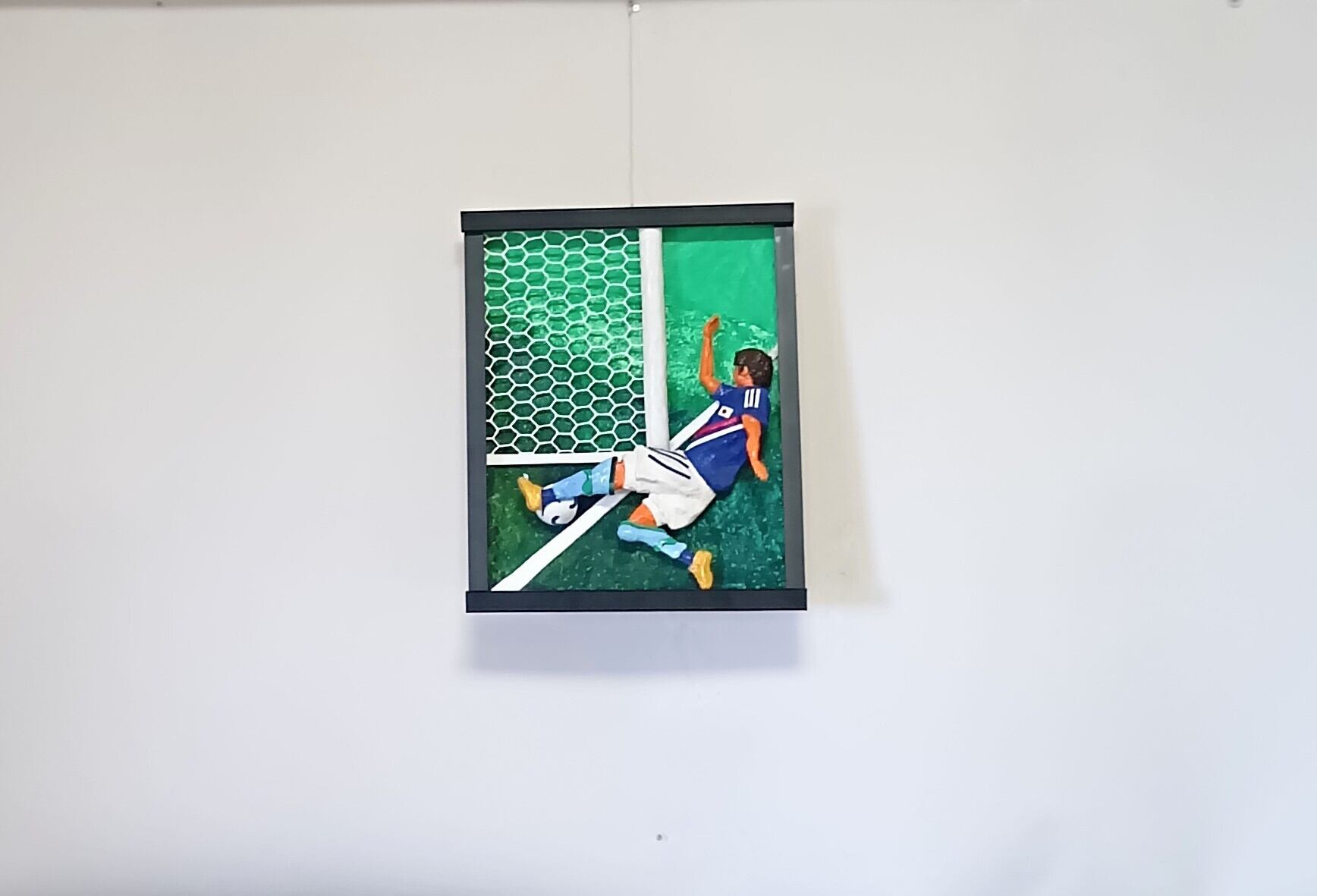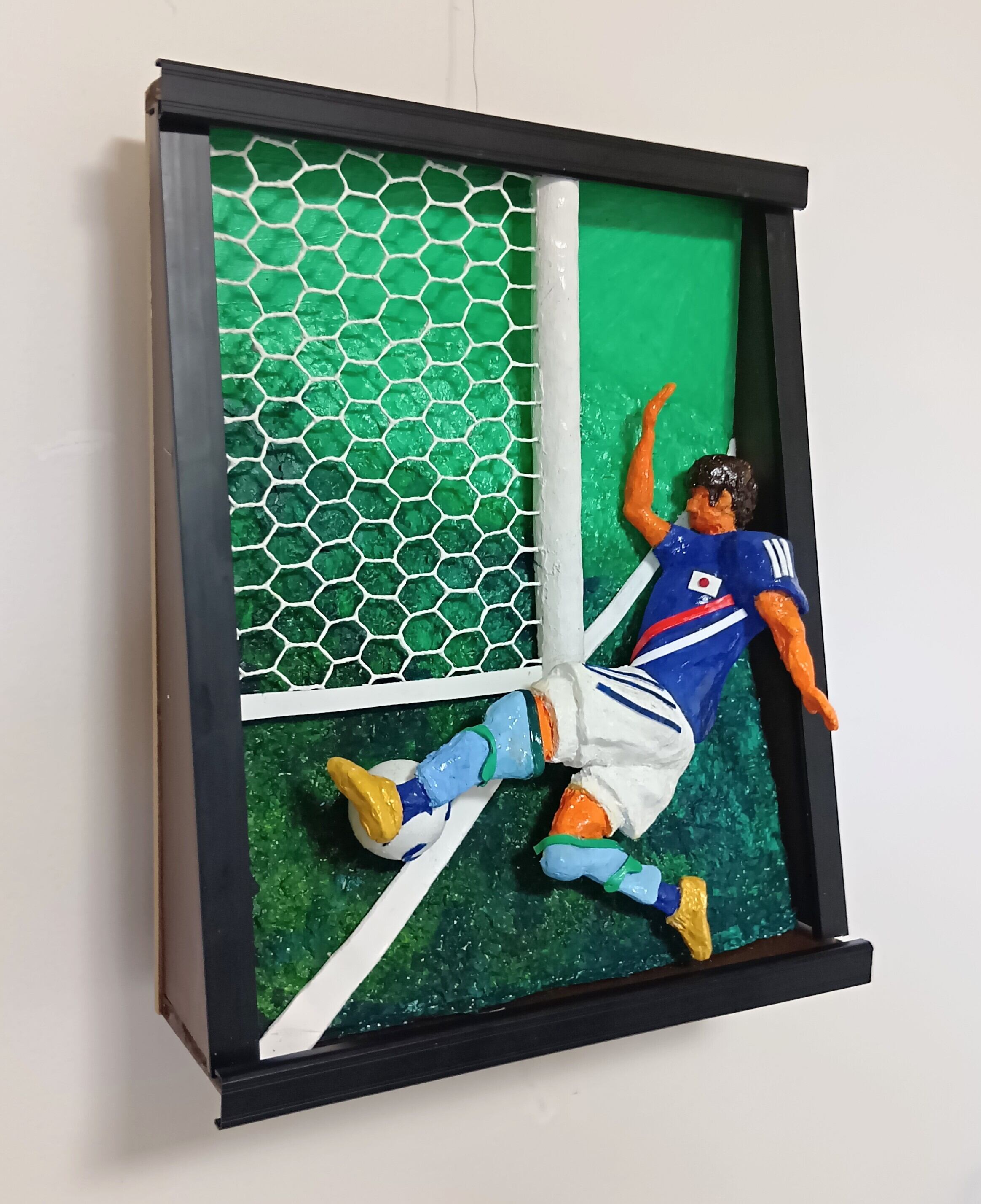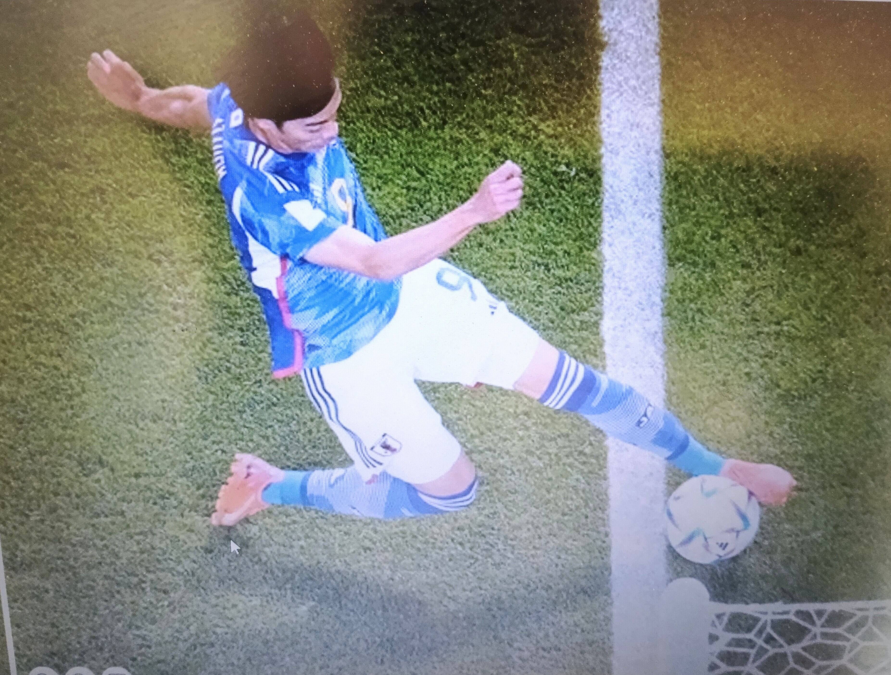 作品は、ボールに滑り込んで、外側に足を打ち込み、ゴールライン内に引き寄せる神技で、味方にパスしてゴール。1mmでも諦めない選手が日本で称賛。