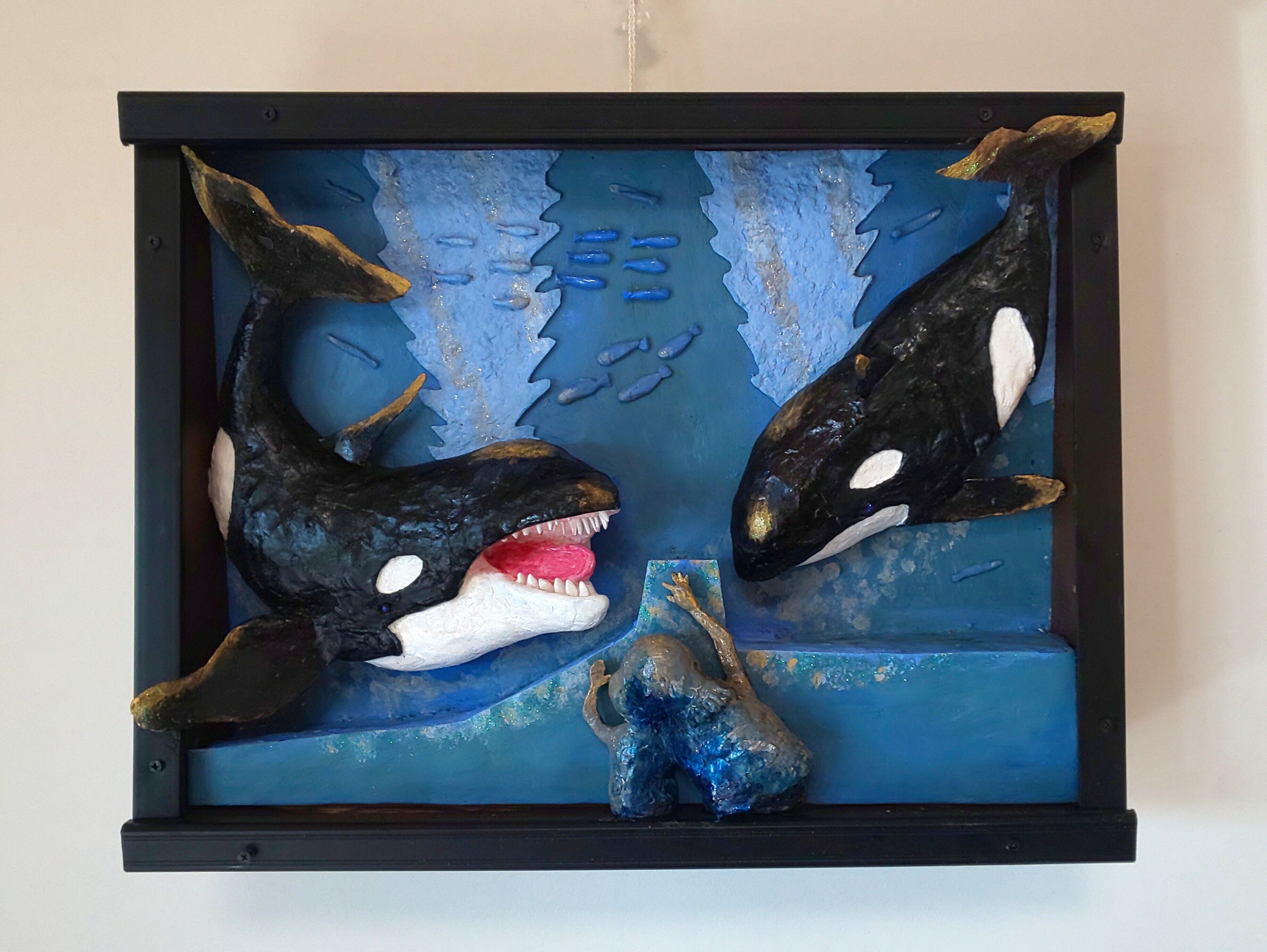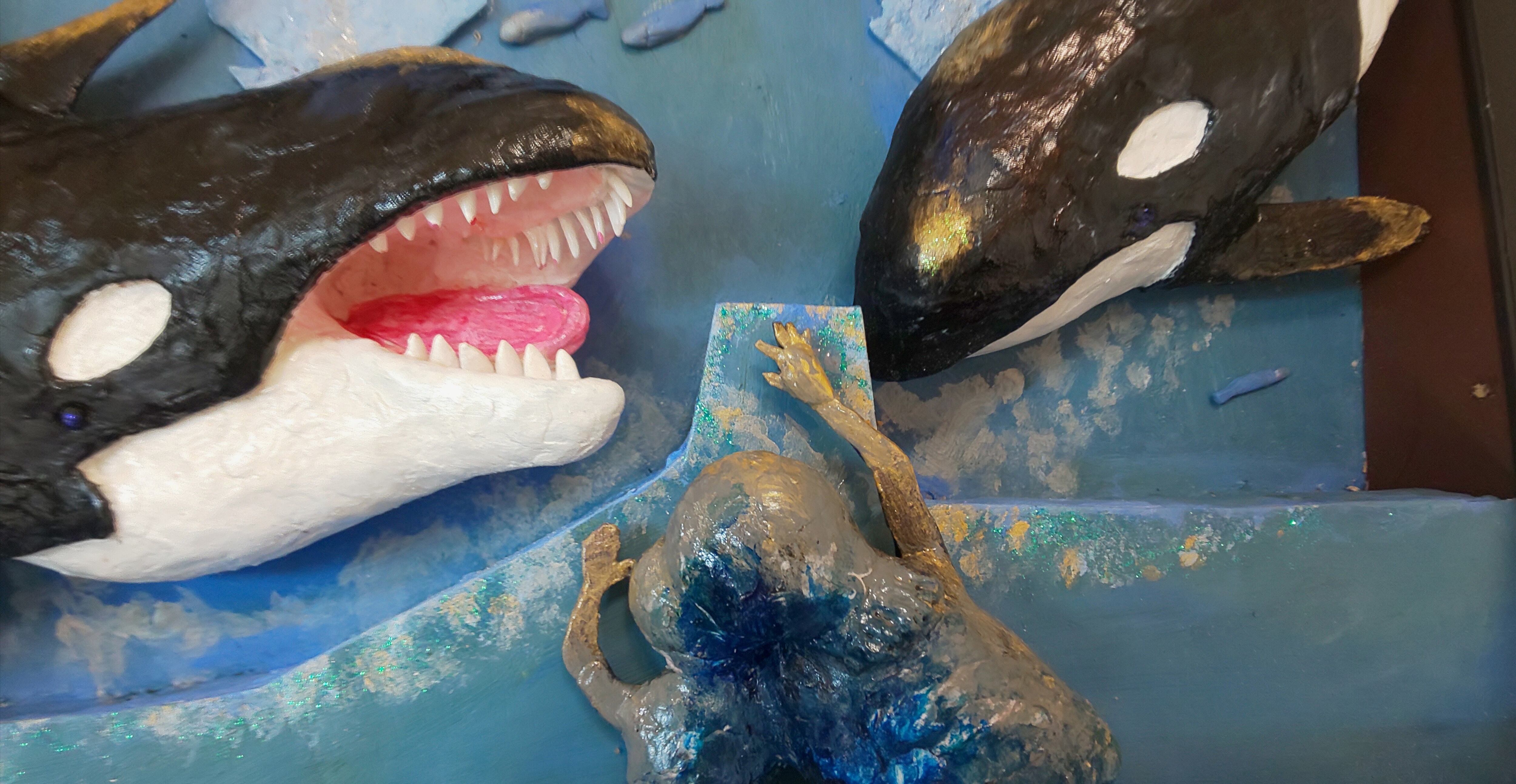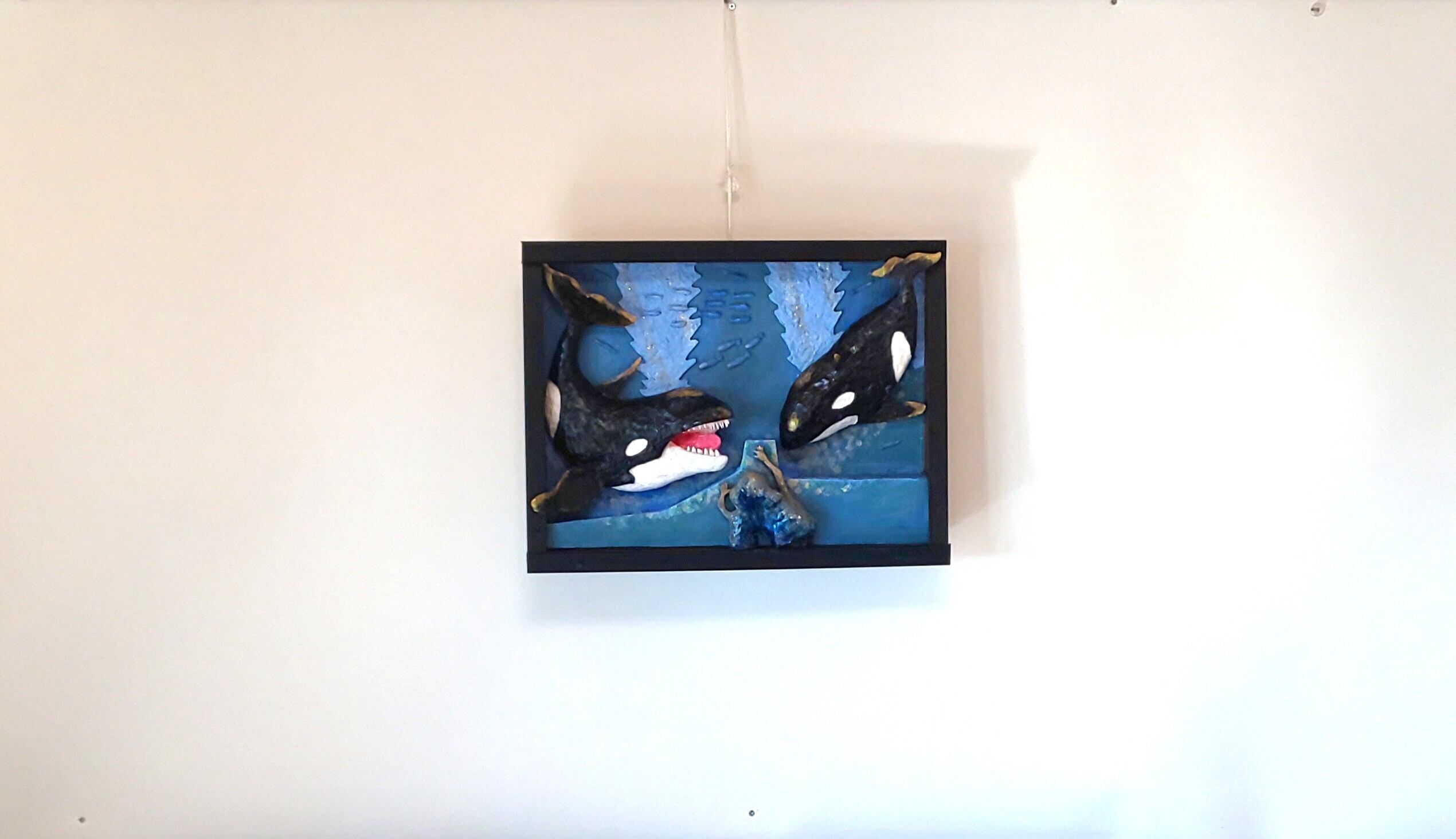 作品は、来館者の親子がシャチを仲良く鑑賞。初めて見るシャチに怖さもなく楽しげな親子に、じゃれて反応する2匹のシャチ。周りの魚に仲間意識が生まれ、みんな自由に楽しく泳いでます。