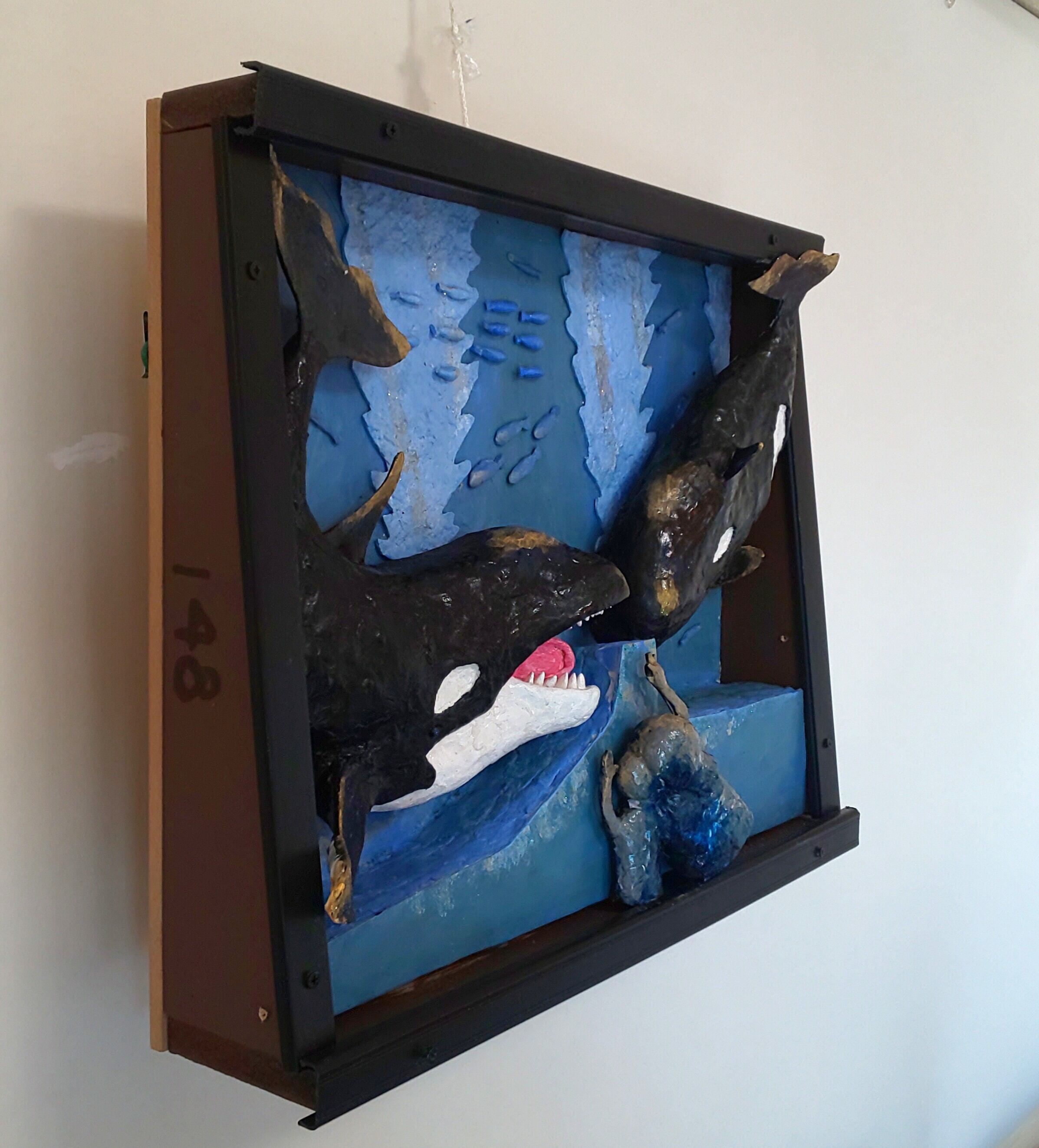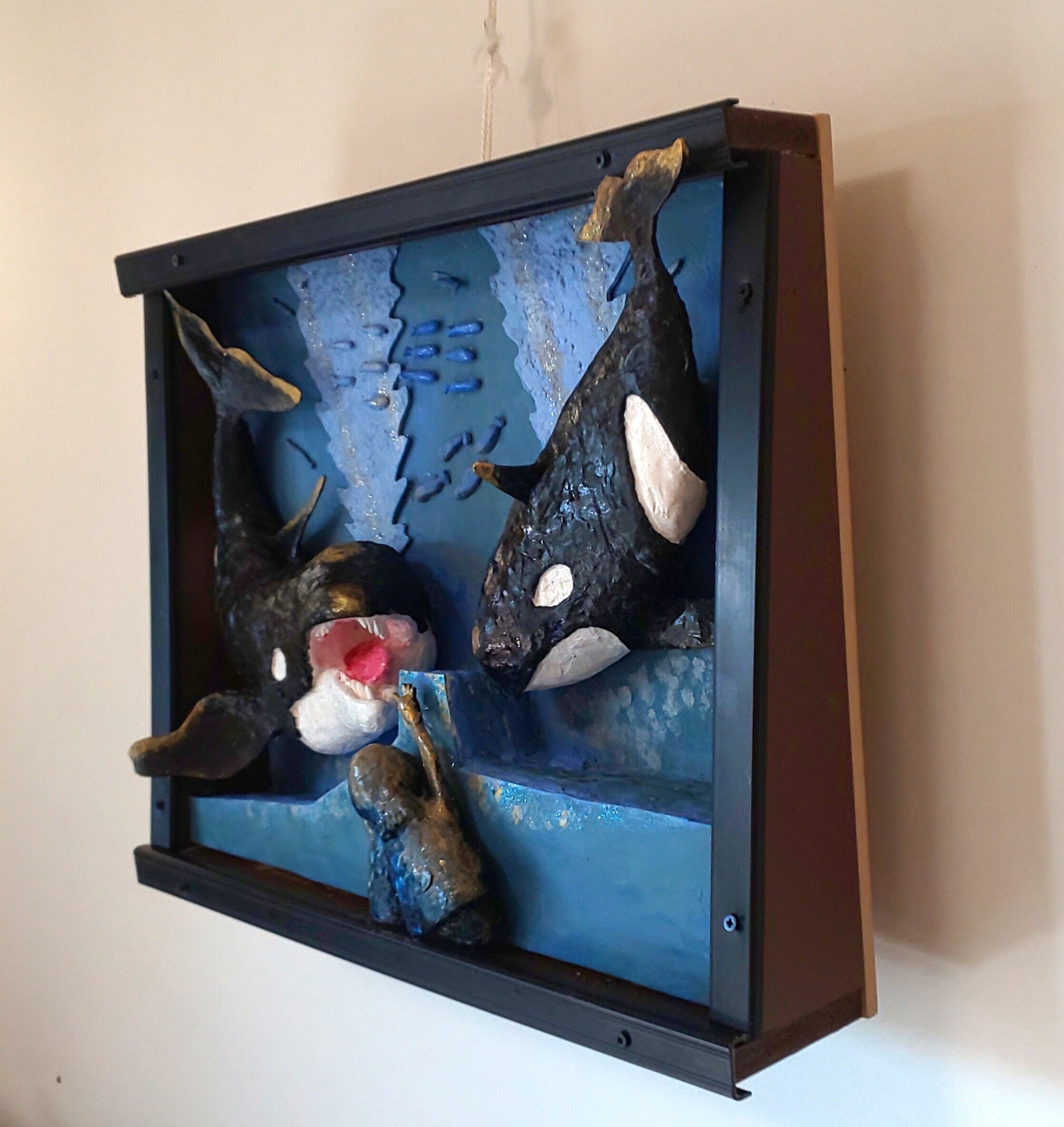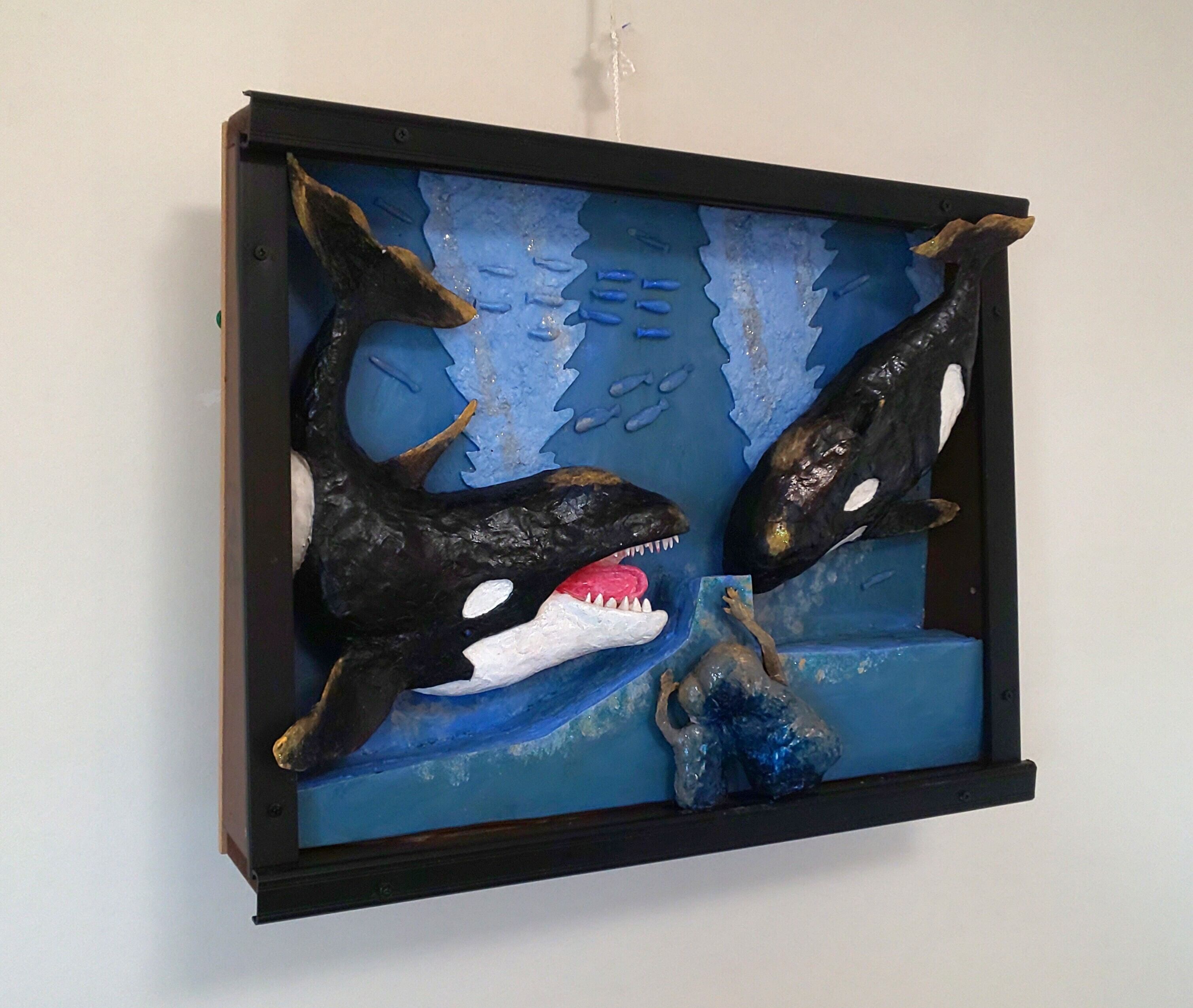 作品は、来館者の親子がシャチを仲良く鑑賞。初めて見るシャチに怖さもなく楽しげな親子に、じゃれて反応する2匹のシャチ。周りの魚に仲間意識が生まれ、みんな自由に楽しく泳いでます。