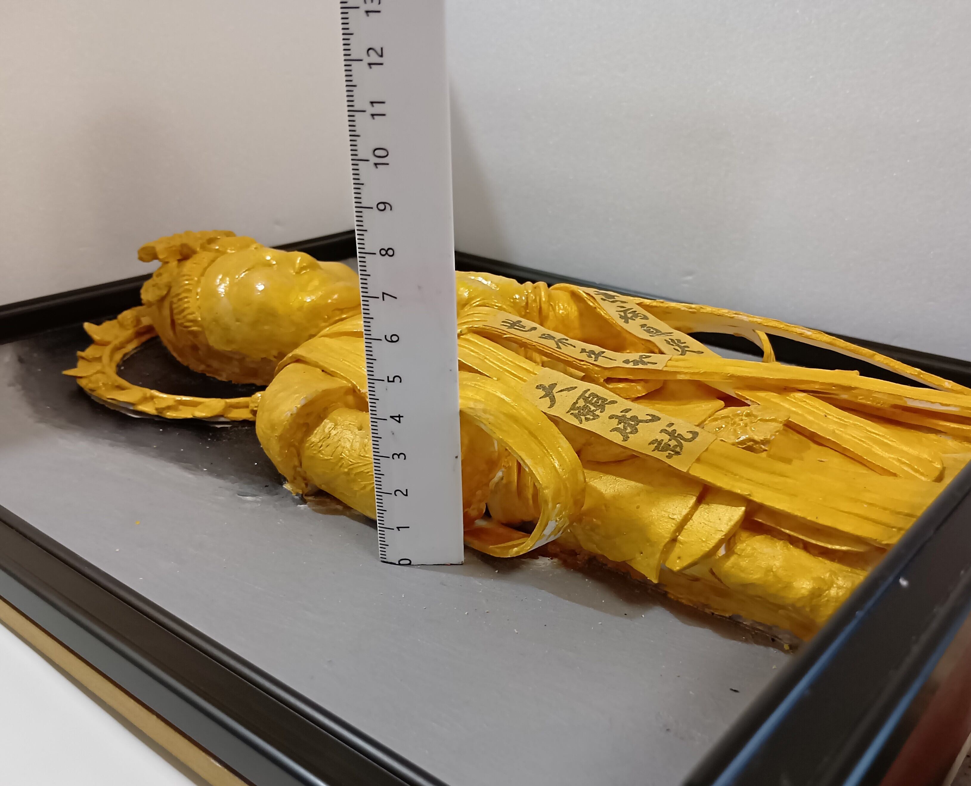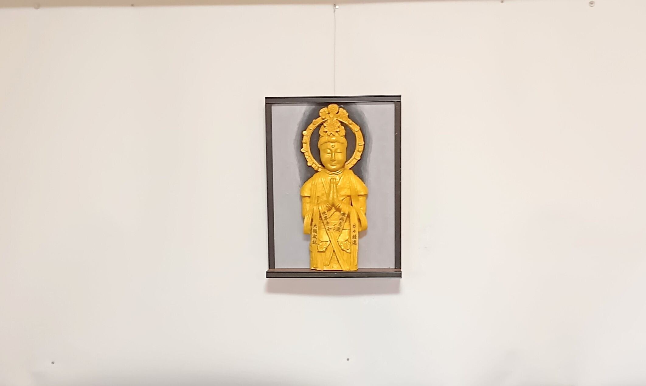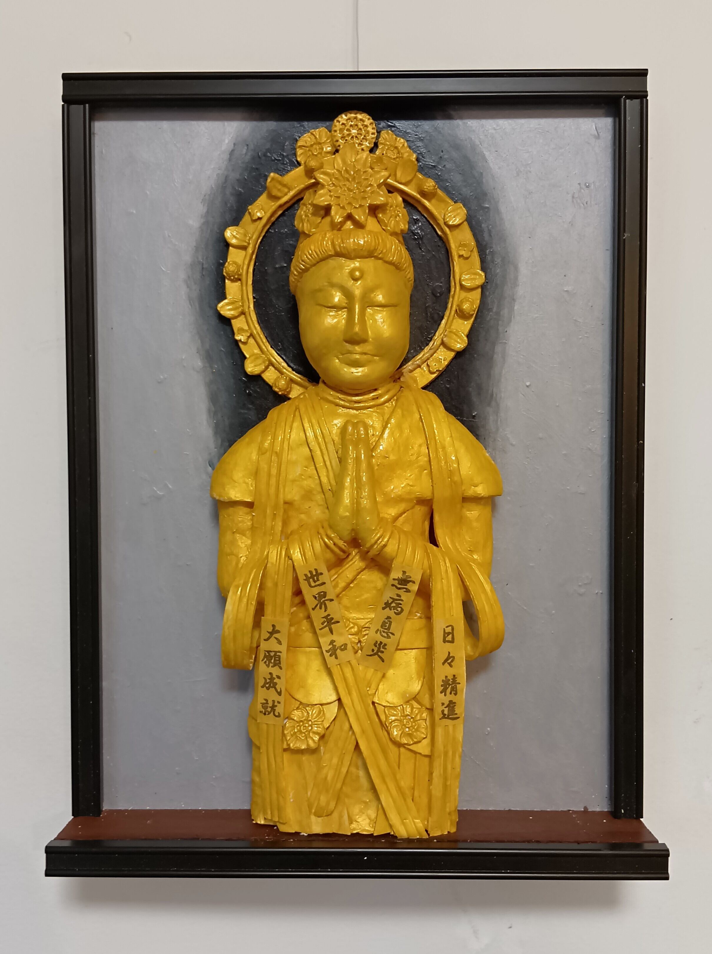 この作品は天衣に「世界平和」と、「無病息災」、「大願成就」、「日々精進」の文字を描いて、救世観音菩薩が祈祷。場所を取らない壁掛けの立体絵画にして祈願しやすくしました。