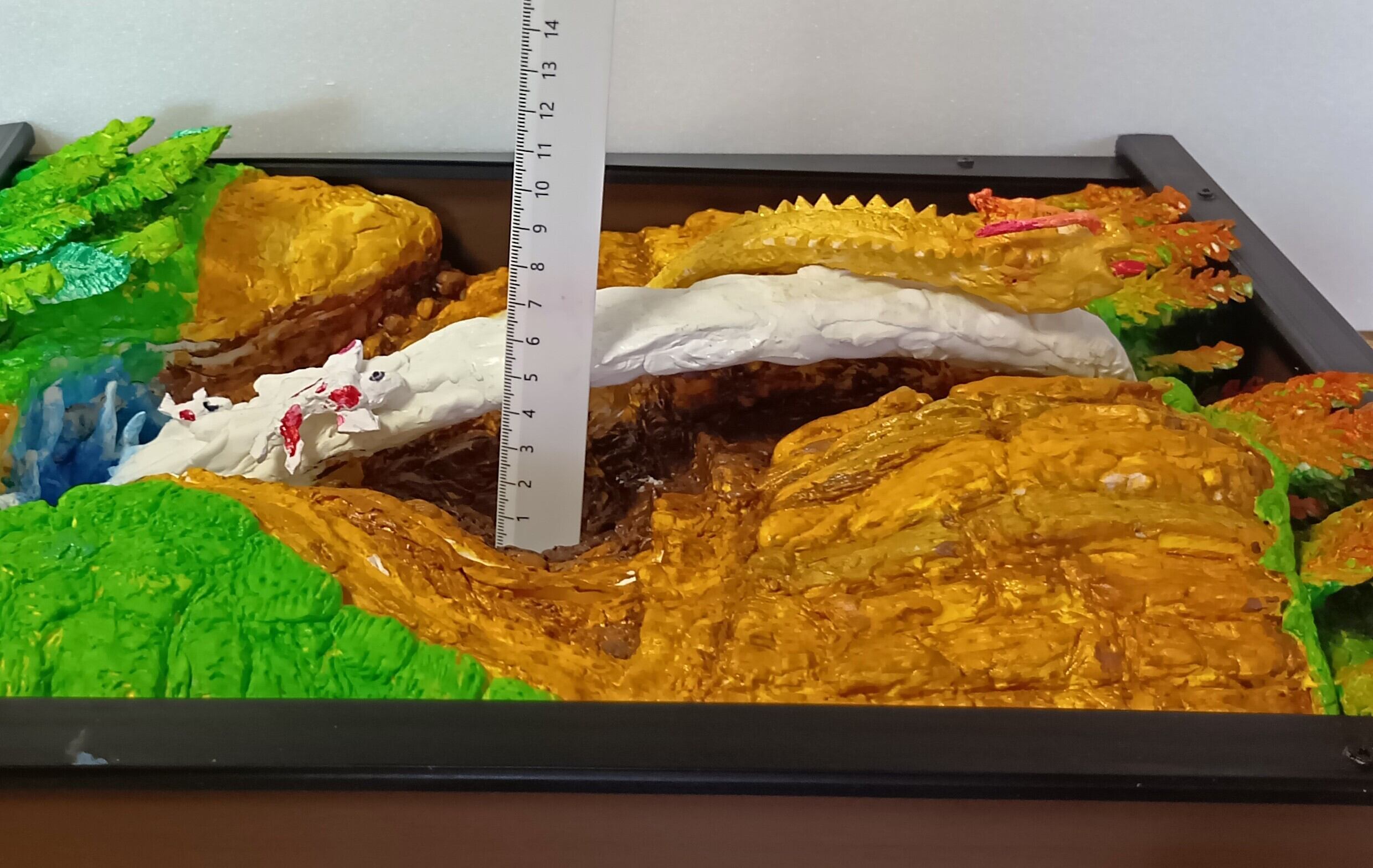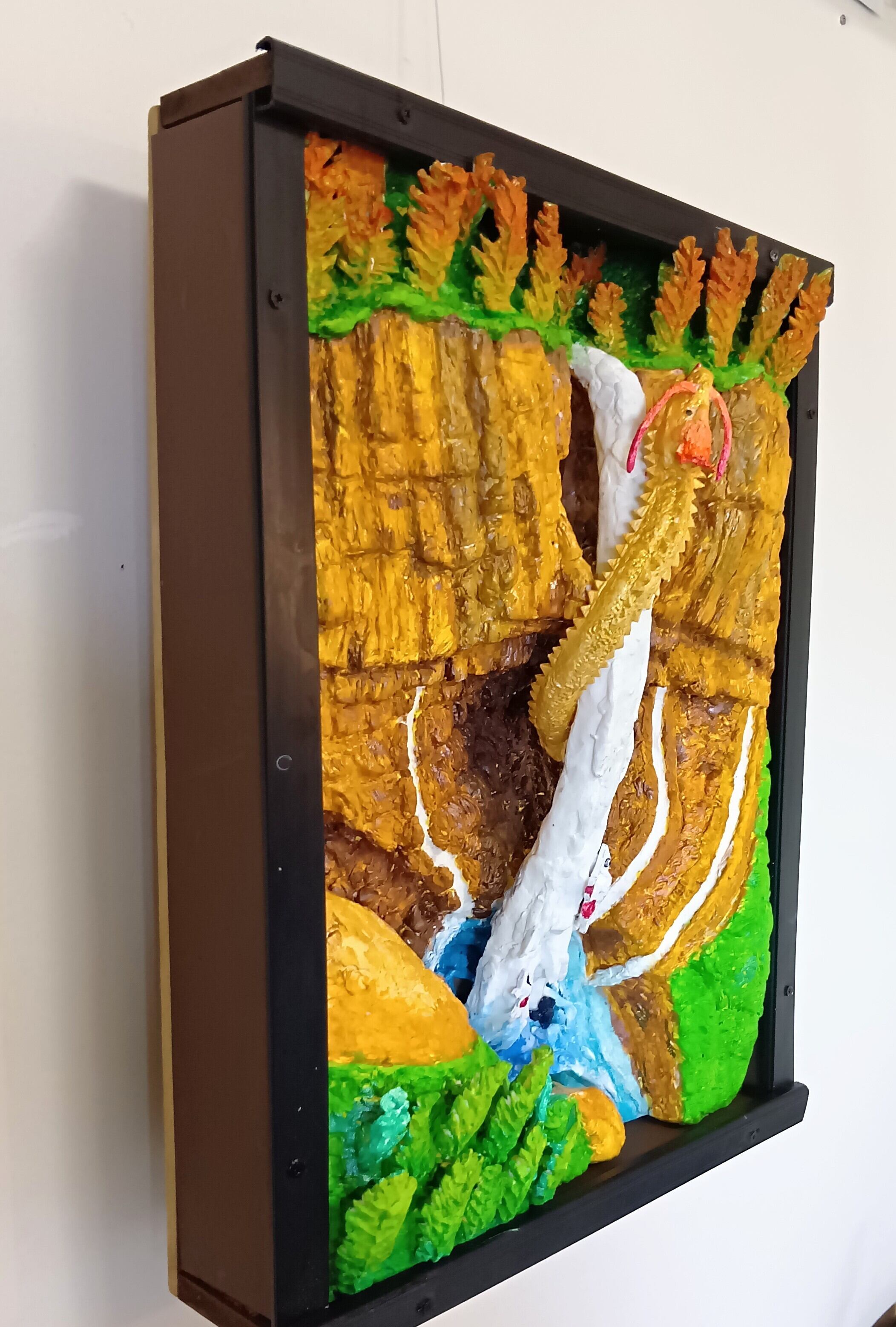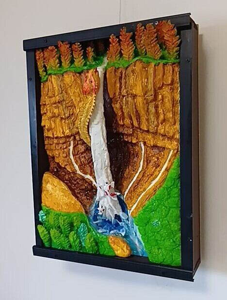 耐久性に優れた樹脂粘土を材料に整形研磨し、硬化と光沢の表面加工剤等で装飾した、未来3D粘土アートの立体絵画。