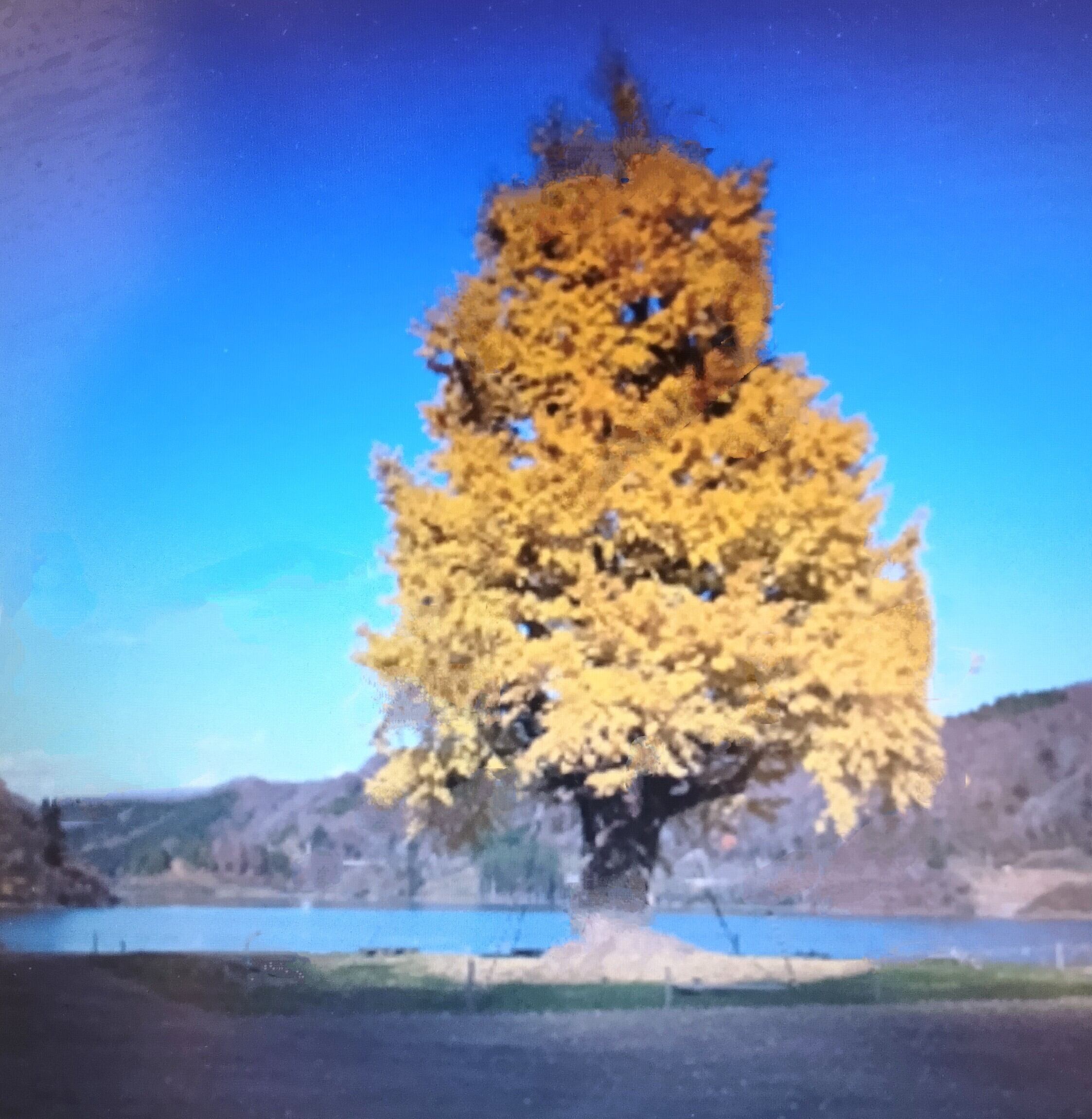 裏山の高台から見ると、沈むはずだった横川ダム湖畔に立つ飛泉寺のイチョウを、背景の湖が囲むようです。沈む夕日と湖の照り返しで紅葉が映えます。命を救われ、元気でますます繁茂成長してるダム湖の大イチョウです。