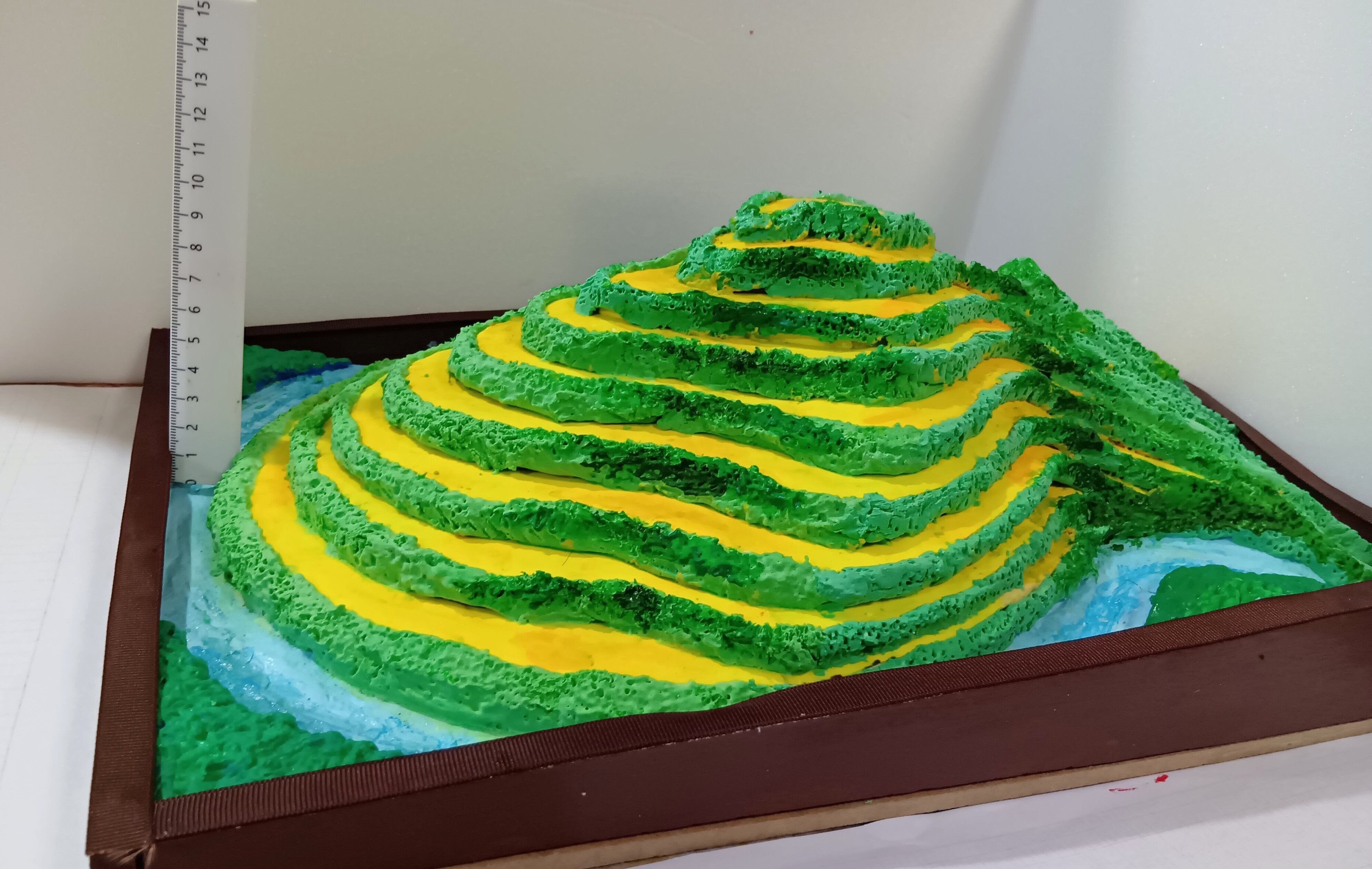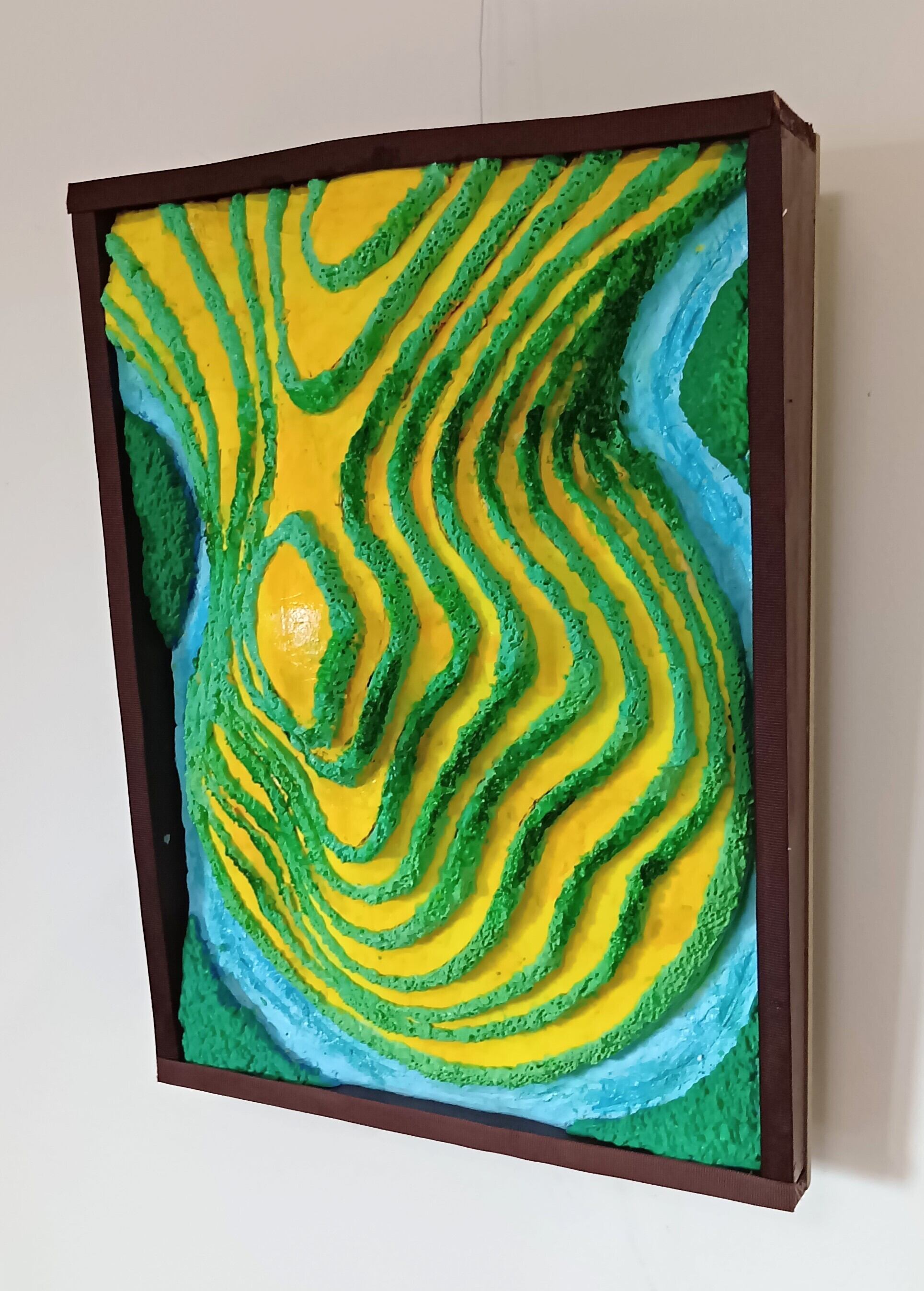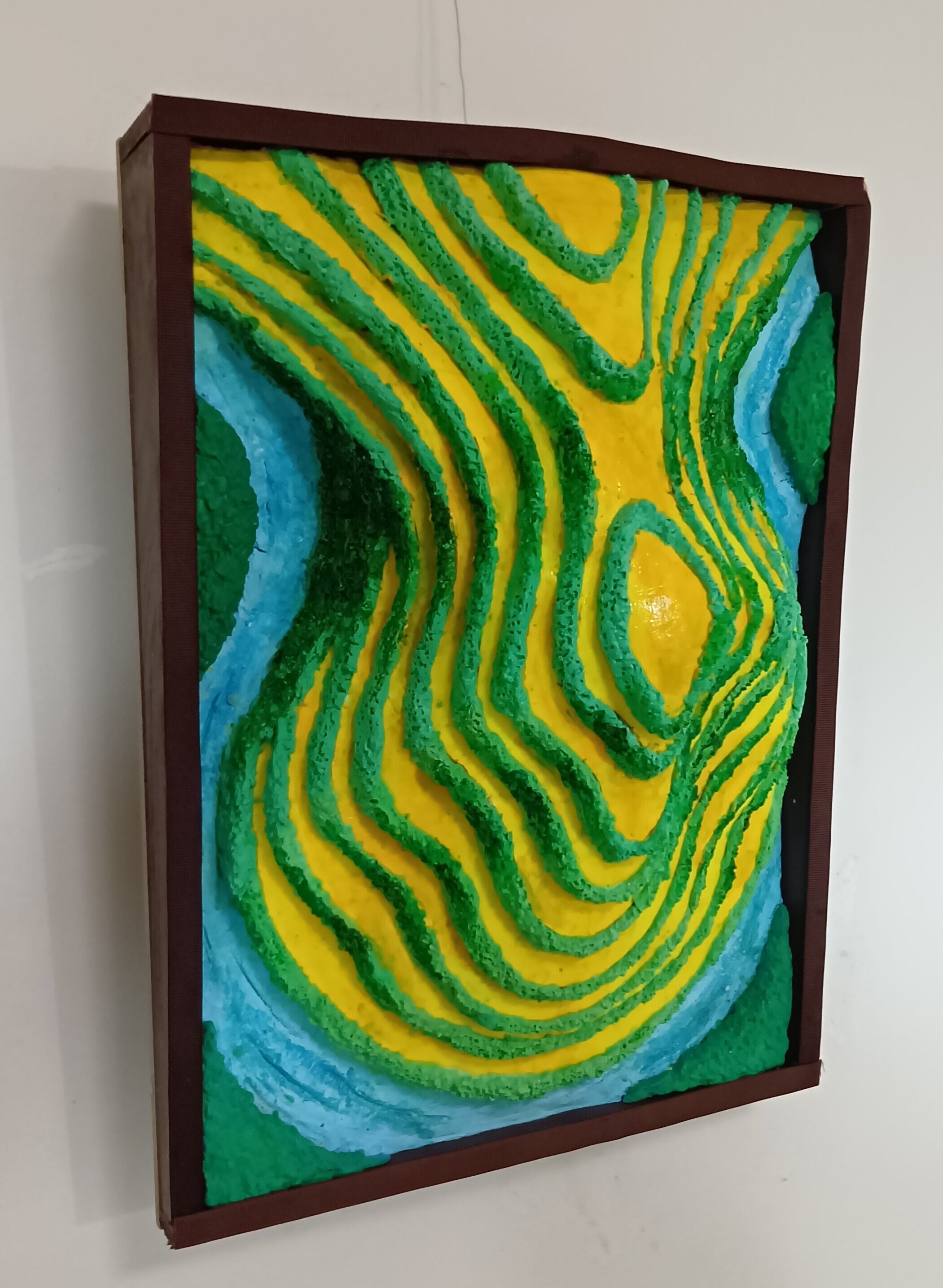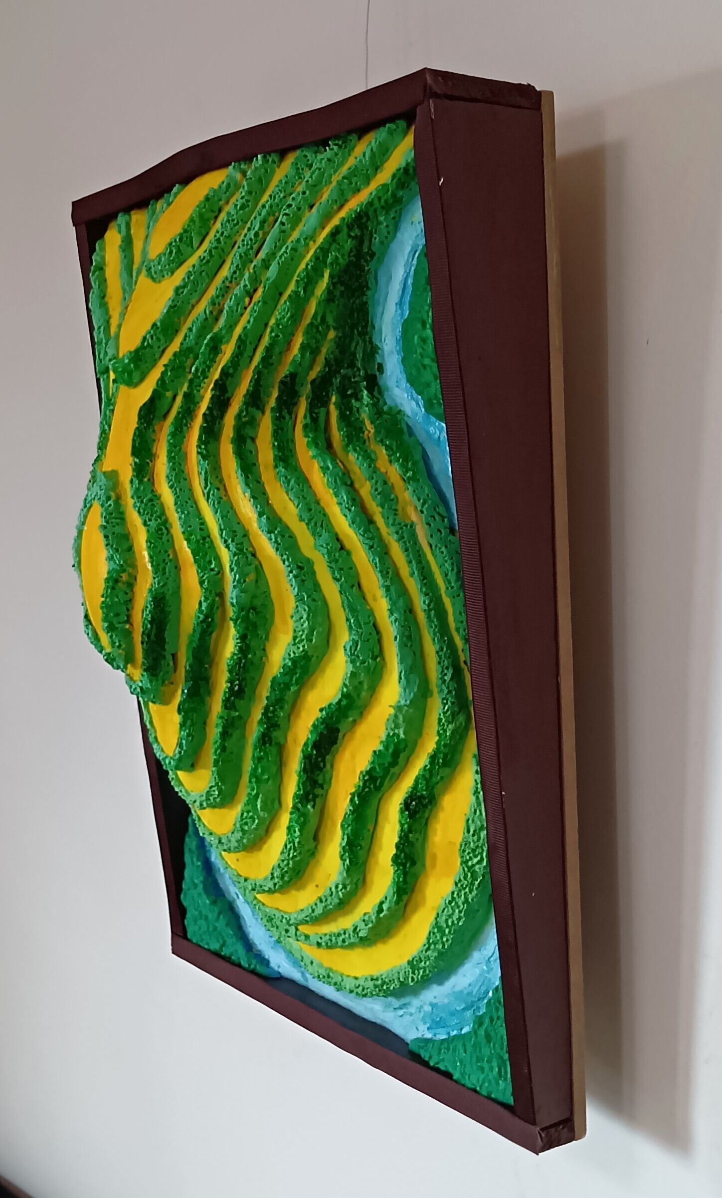 作品は、扇を広げたような優美な曲線を描く棚田。現地ムオンホアン川が穿入蛇行(せんにゅうだこう)の作用で曲がりくねり浸食し深い谷を造りながら、扇状の丸い棚田を形成。北から流れた川は谷にぶつかりながらまた北上。遊休地がないほど黄金色の稲穂が並び、ベトナム人の高い勤労精神の傑作田園を立体絵画にしてみました。