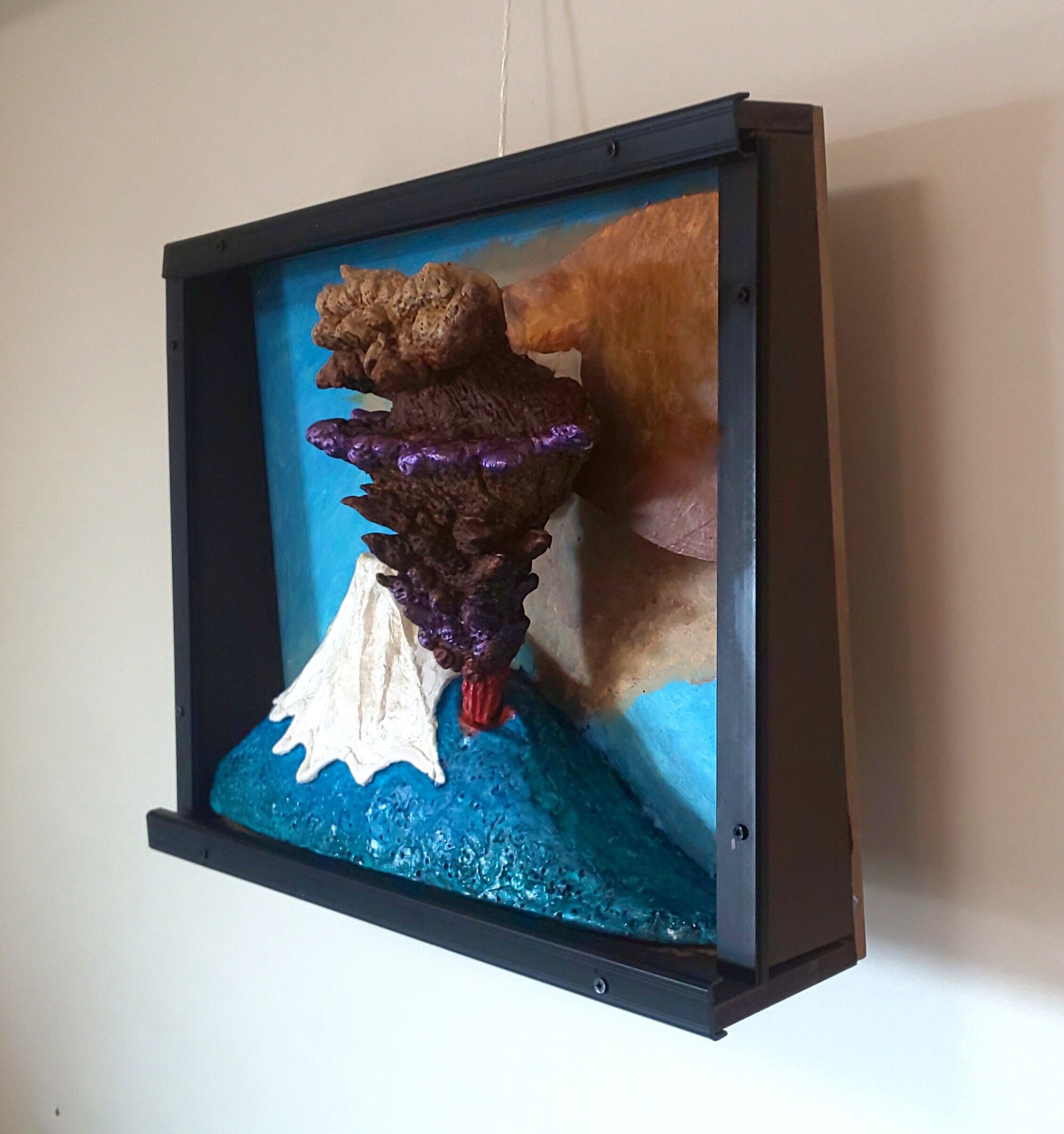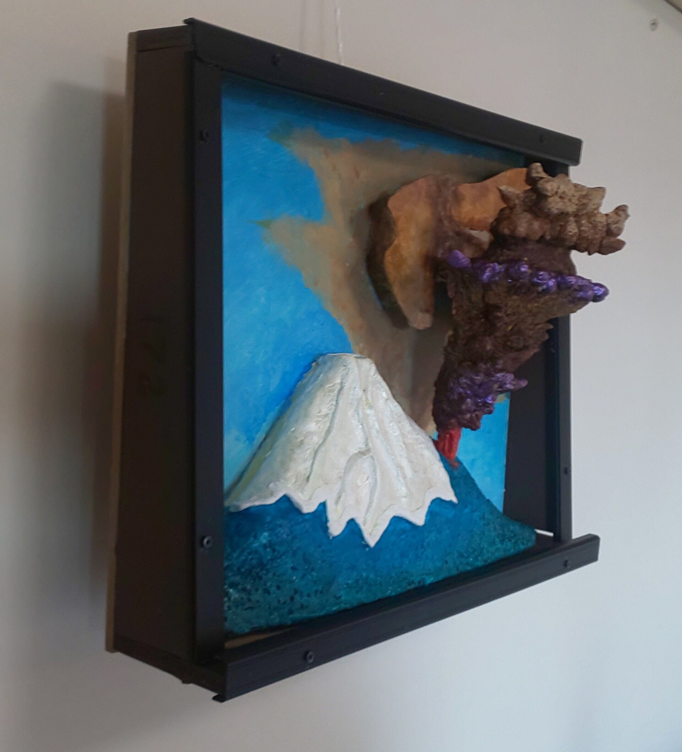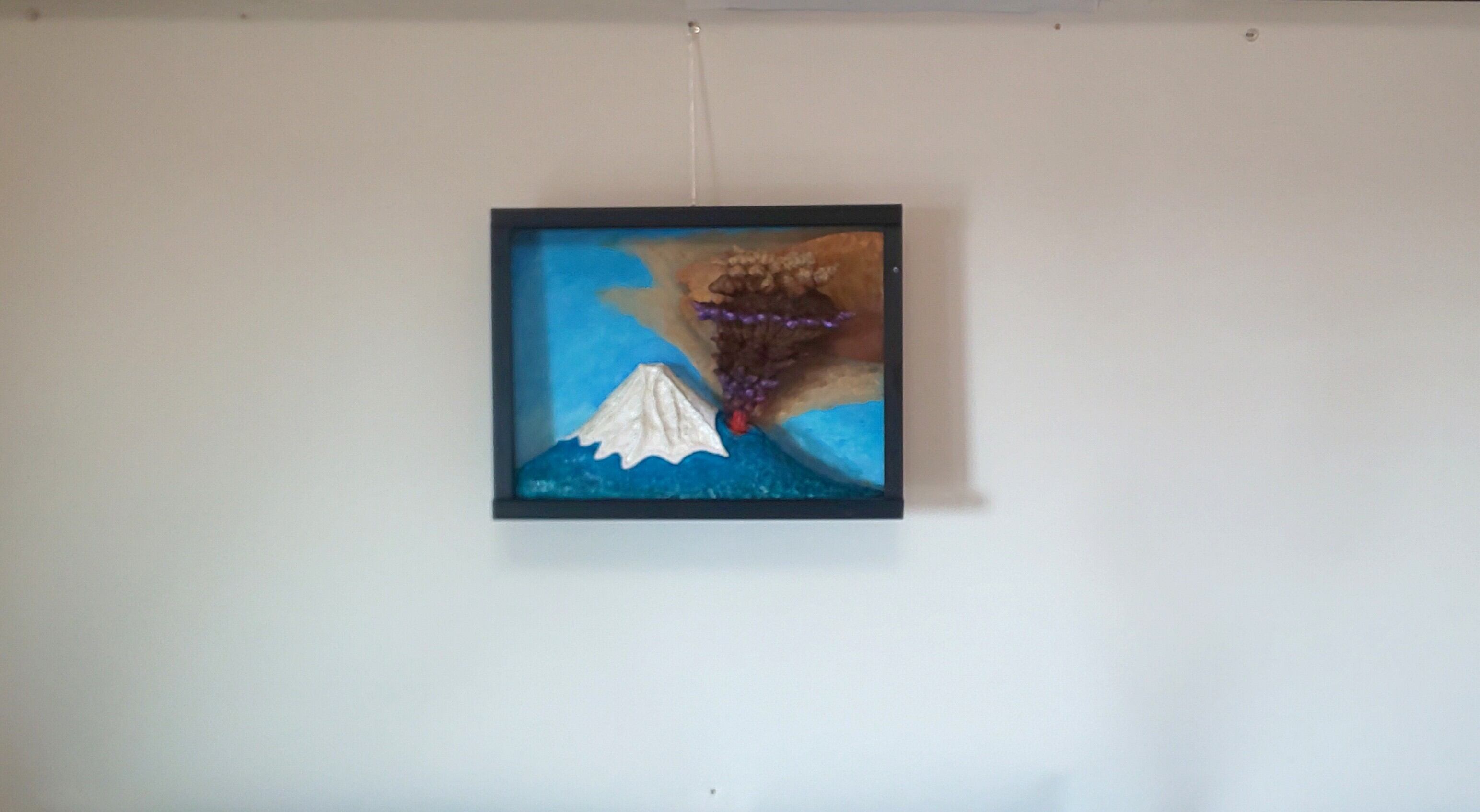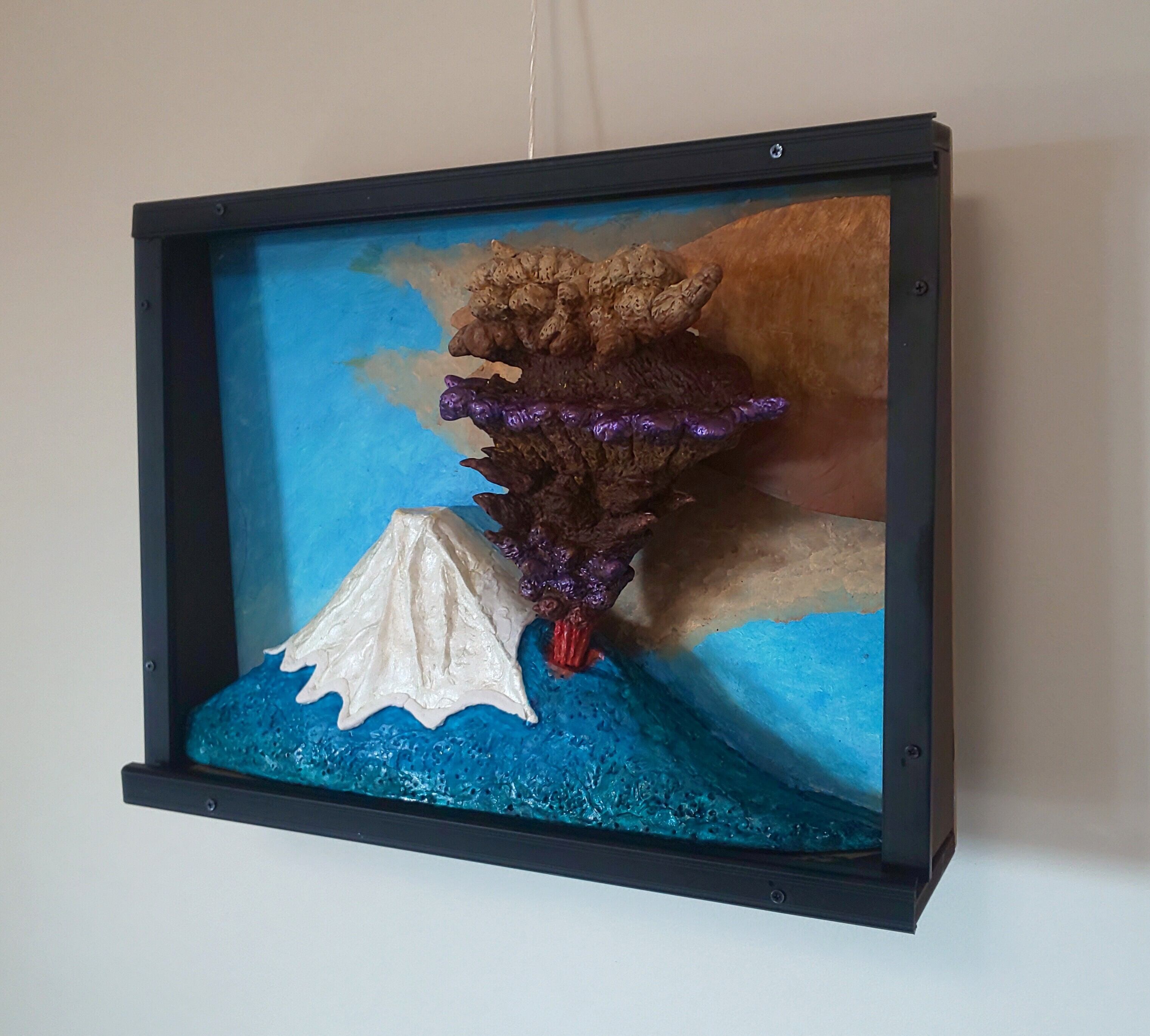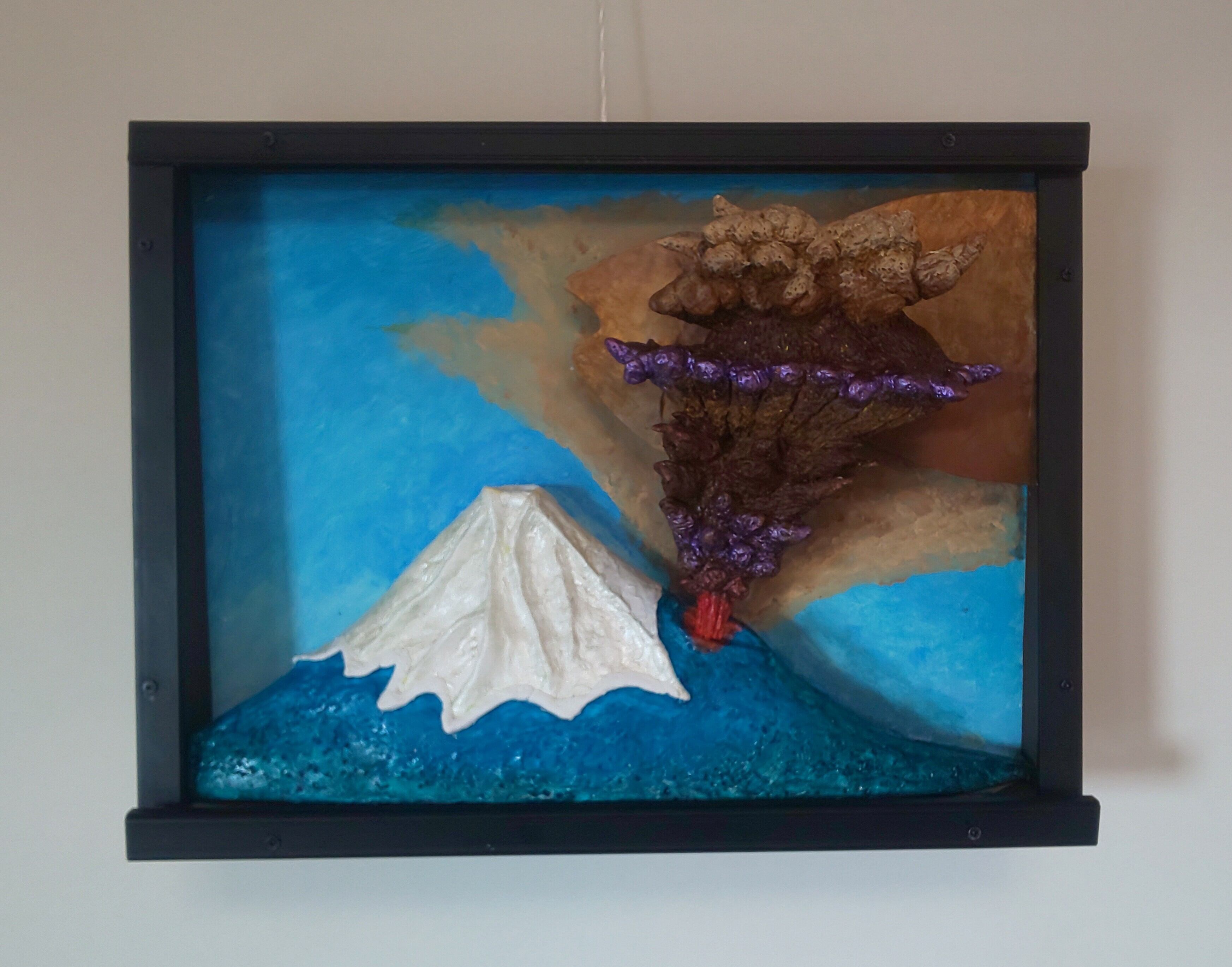 作品は噴火直後の様子で、火柱や噴火雲は当時の記録絵を参考にしました。大量の火山灰は東側へと流され、雪はとけてます。