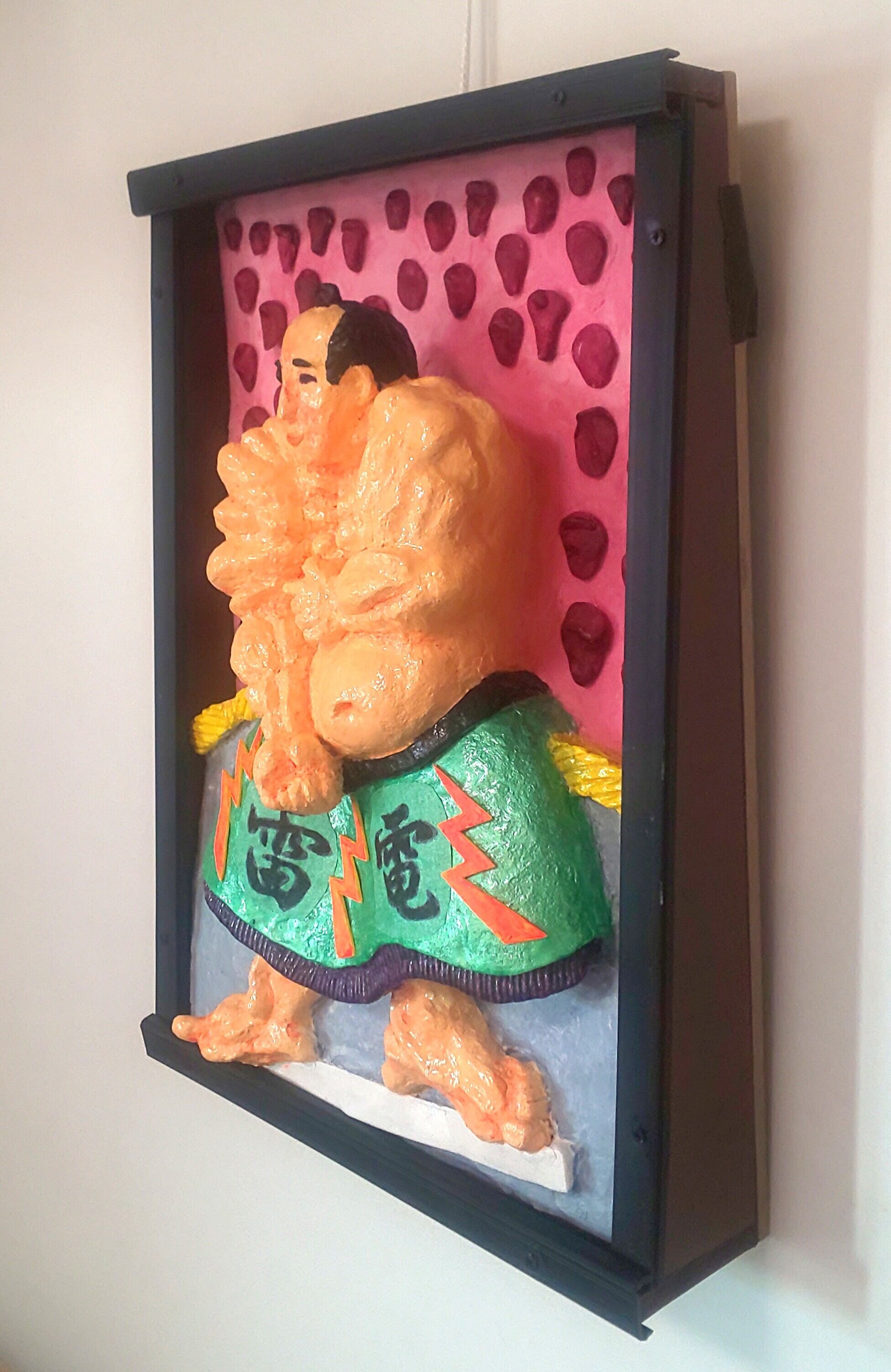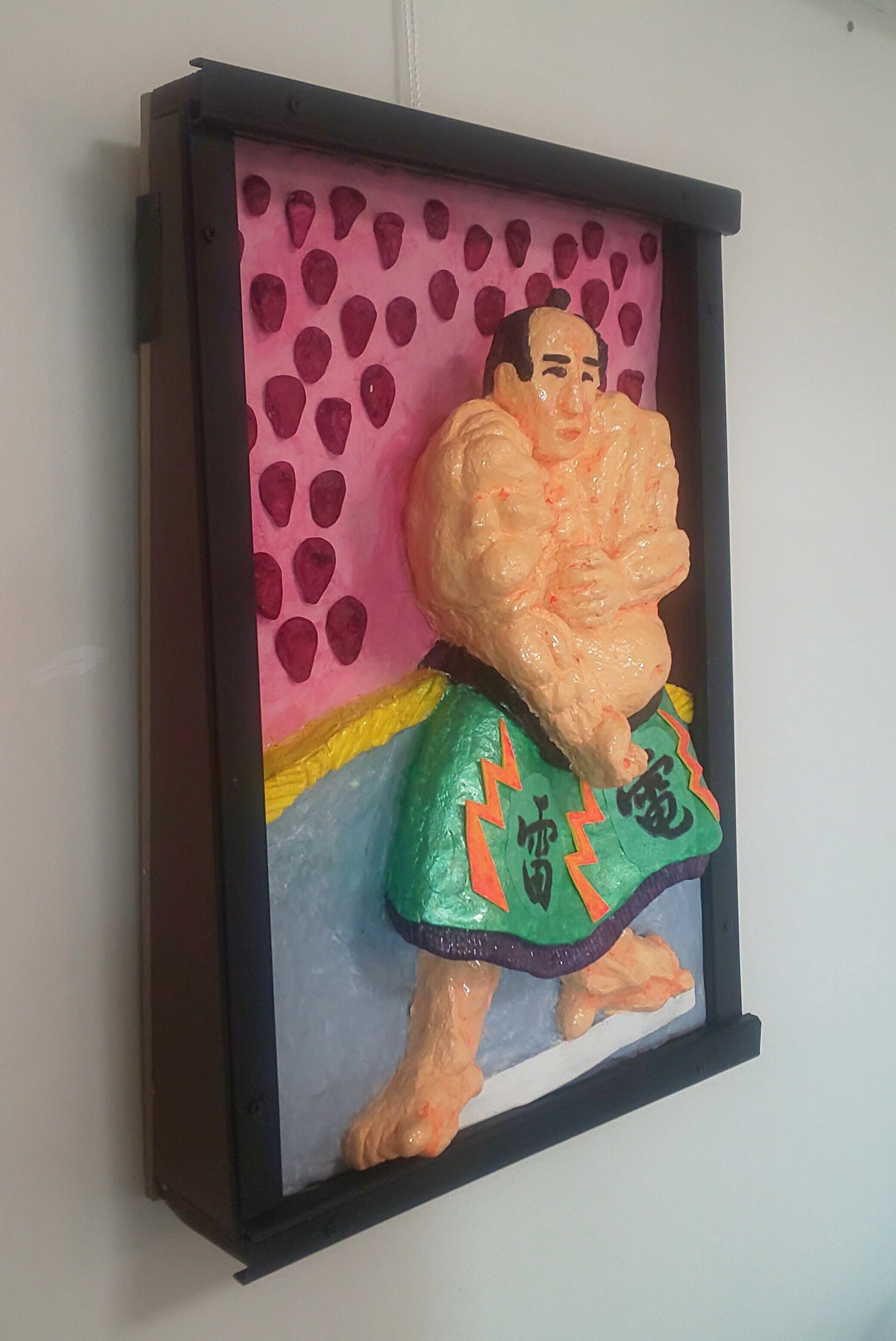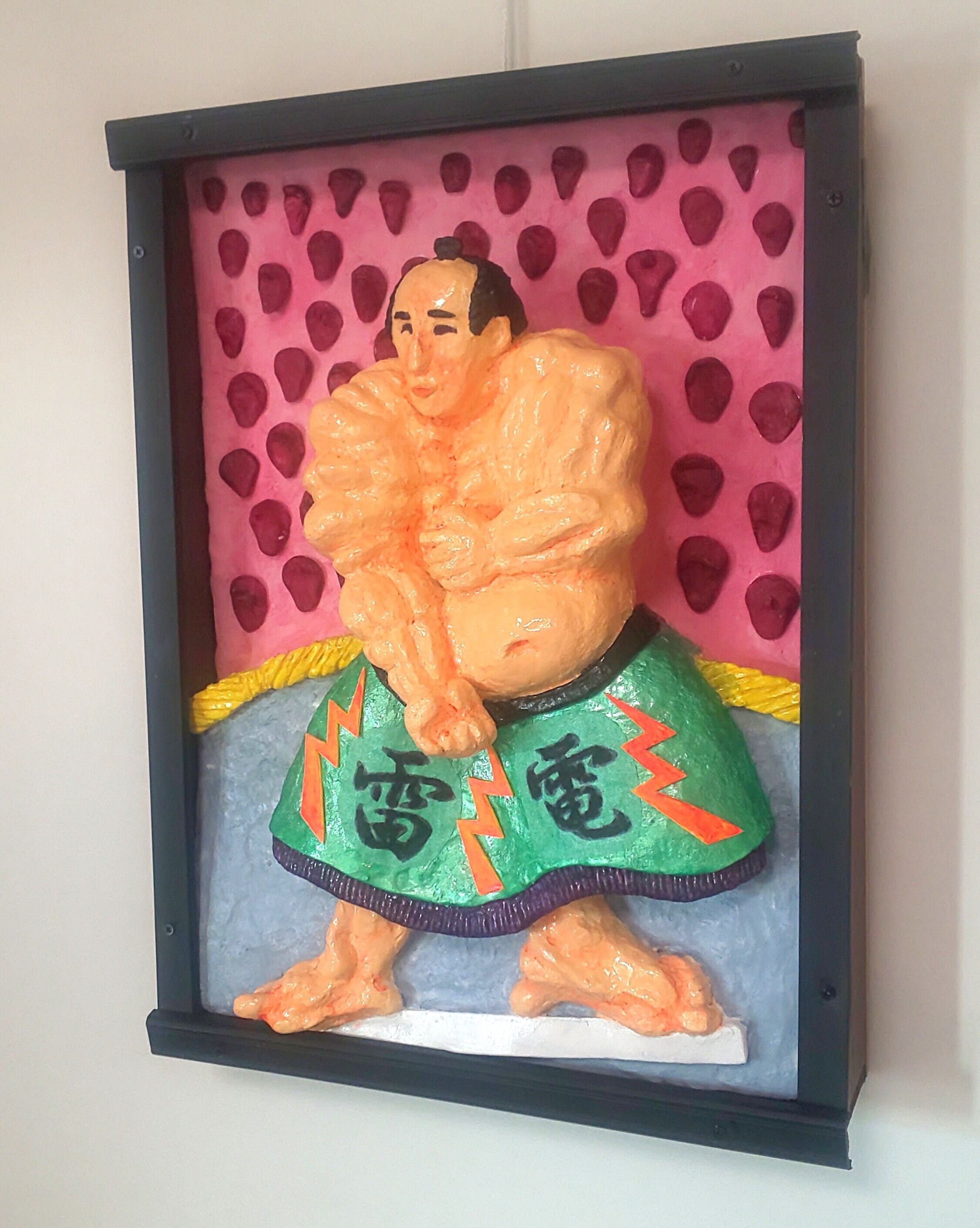 作品は、江戸時代当時の複数の似顔絵を参考に作成(最後の写真など参考)。天下無双の強靭な力士でも、雷電は教養があり、柔和な顔立ちで性格も温厚でした。