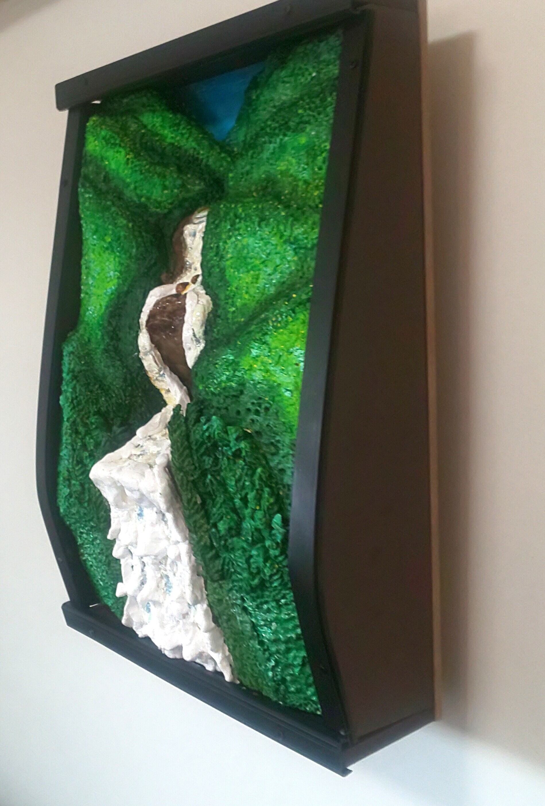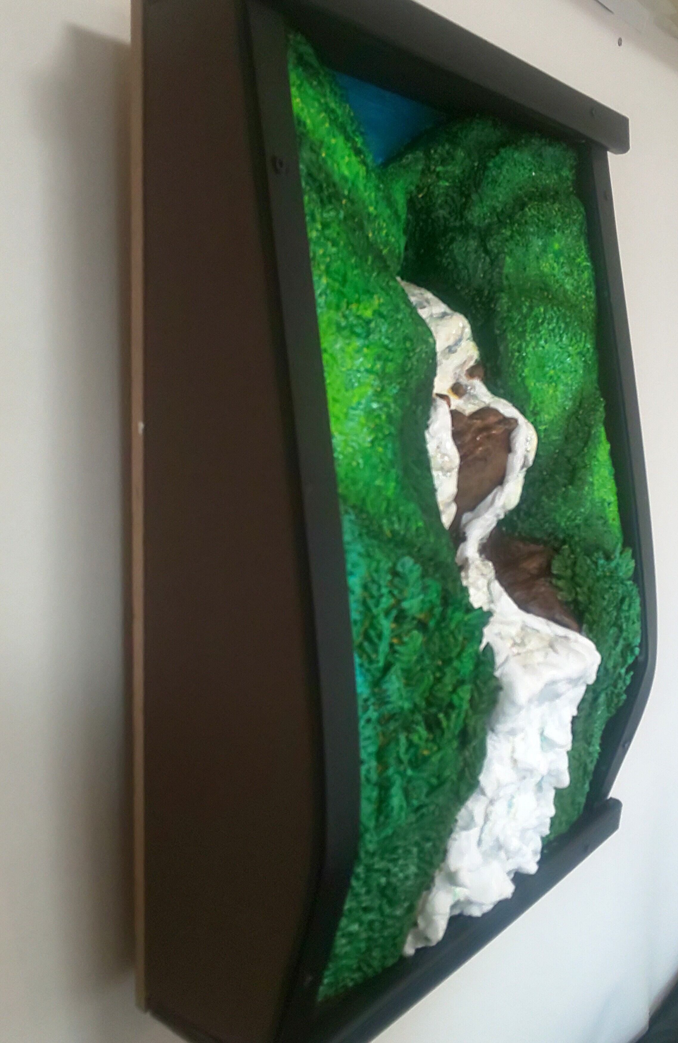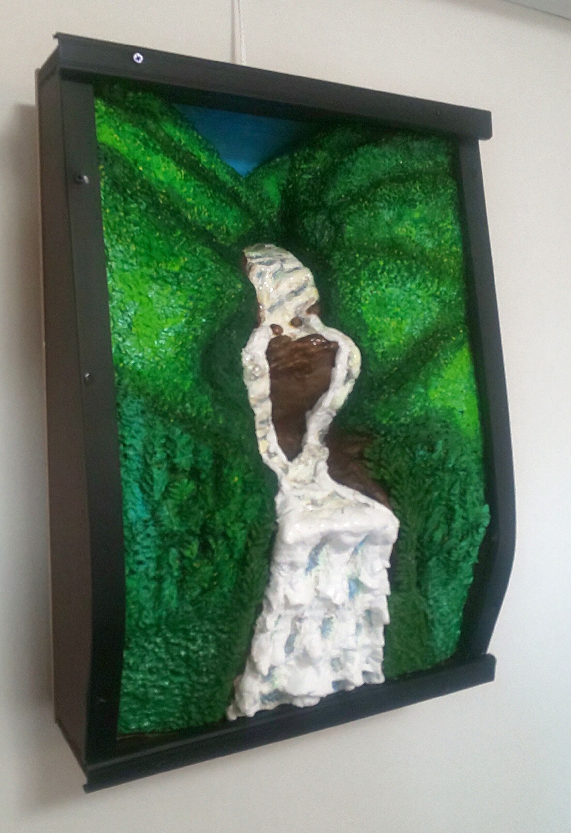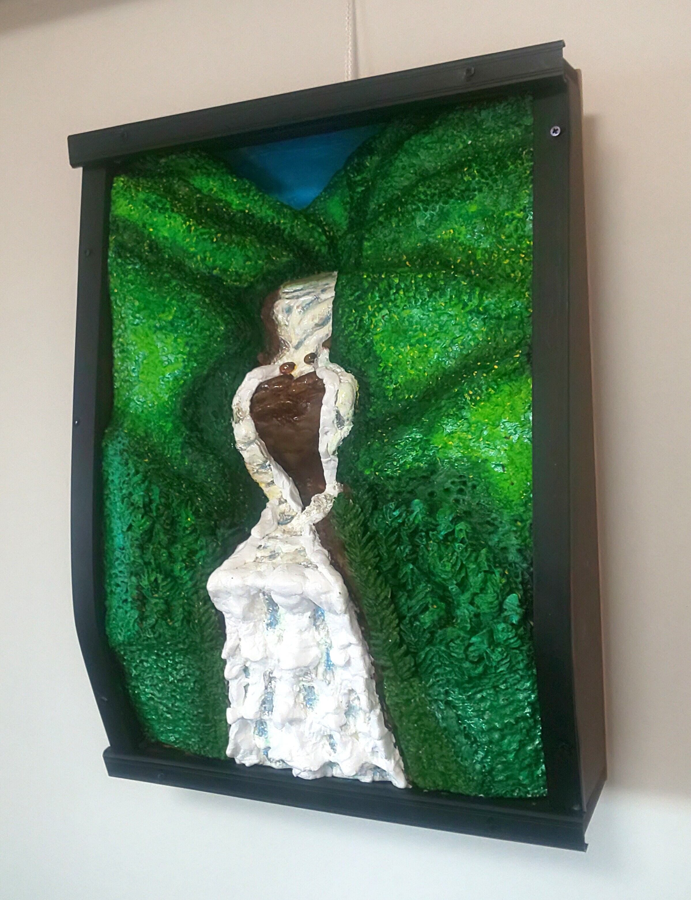 耐久性に優れた樹脂粘土を材料に整形研磨し、硬化と光沢の表面加工剤等で装飾した、未来3D粘土アートの立体絵画。