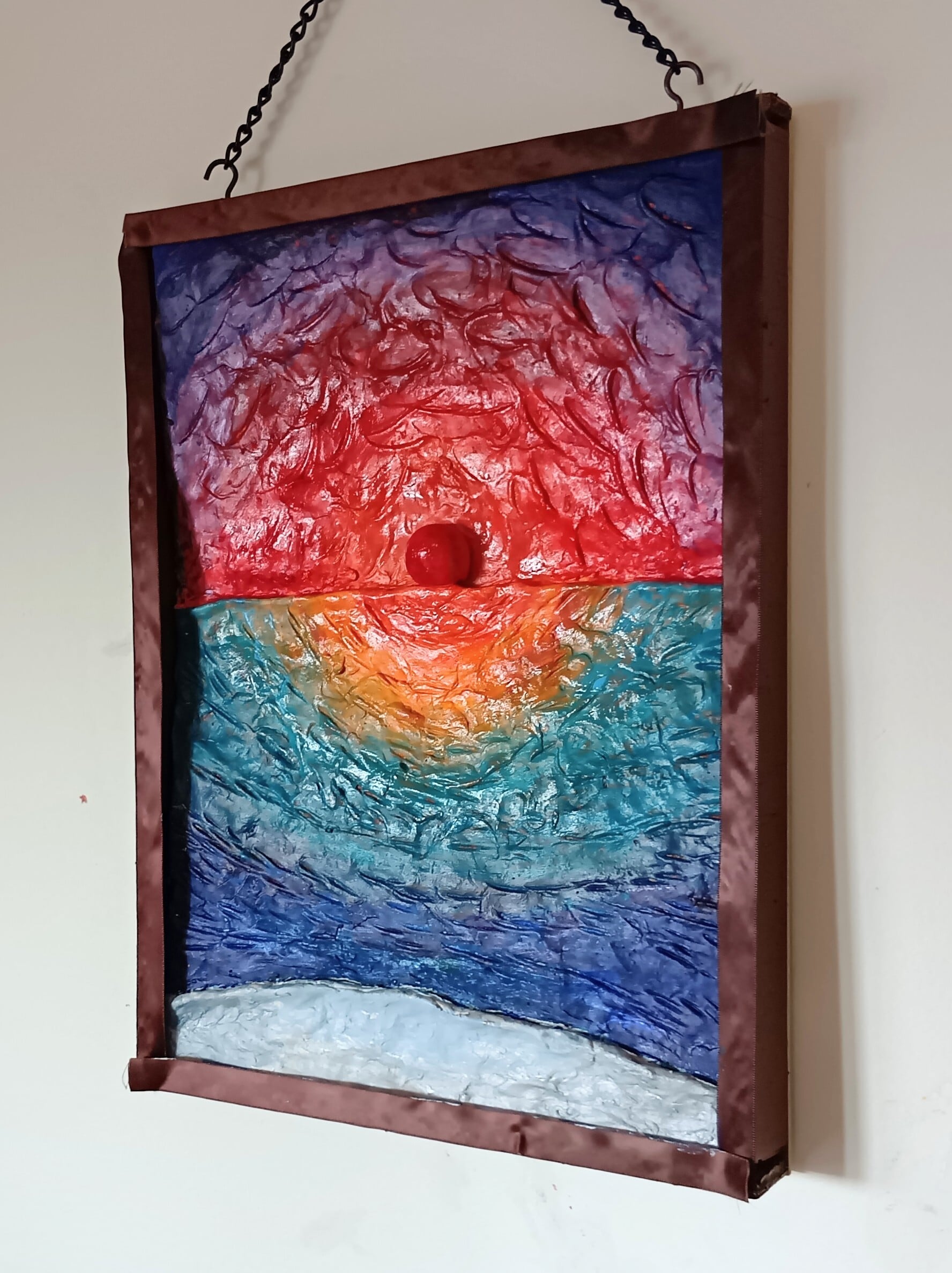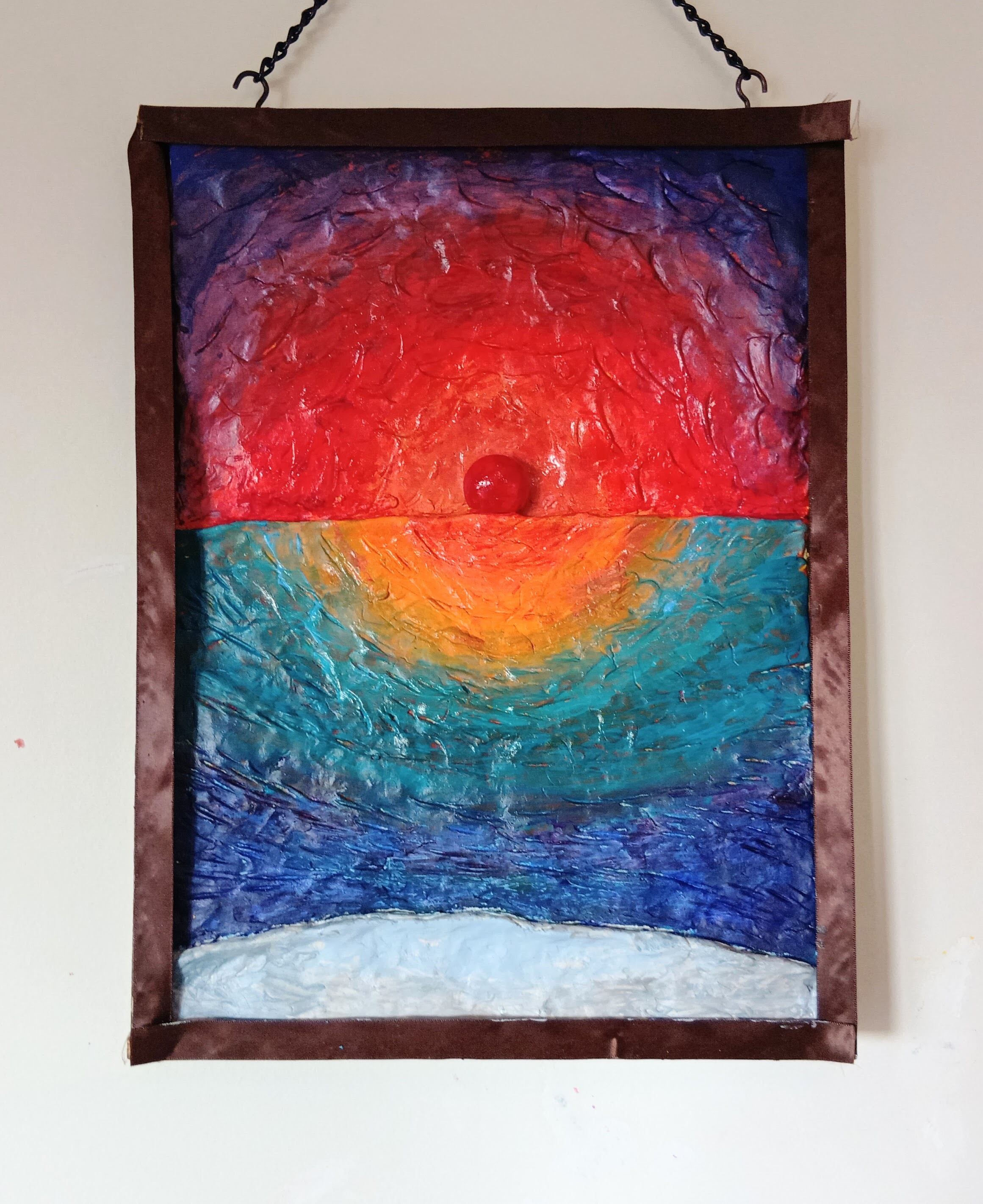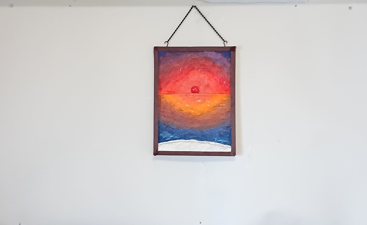 作品は、海上から昇る日の出の「浜辺からの朝日」の立体絵画。