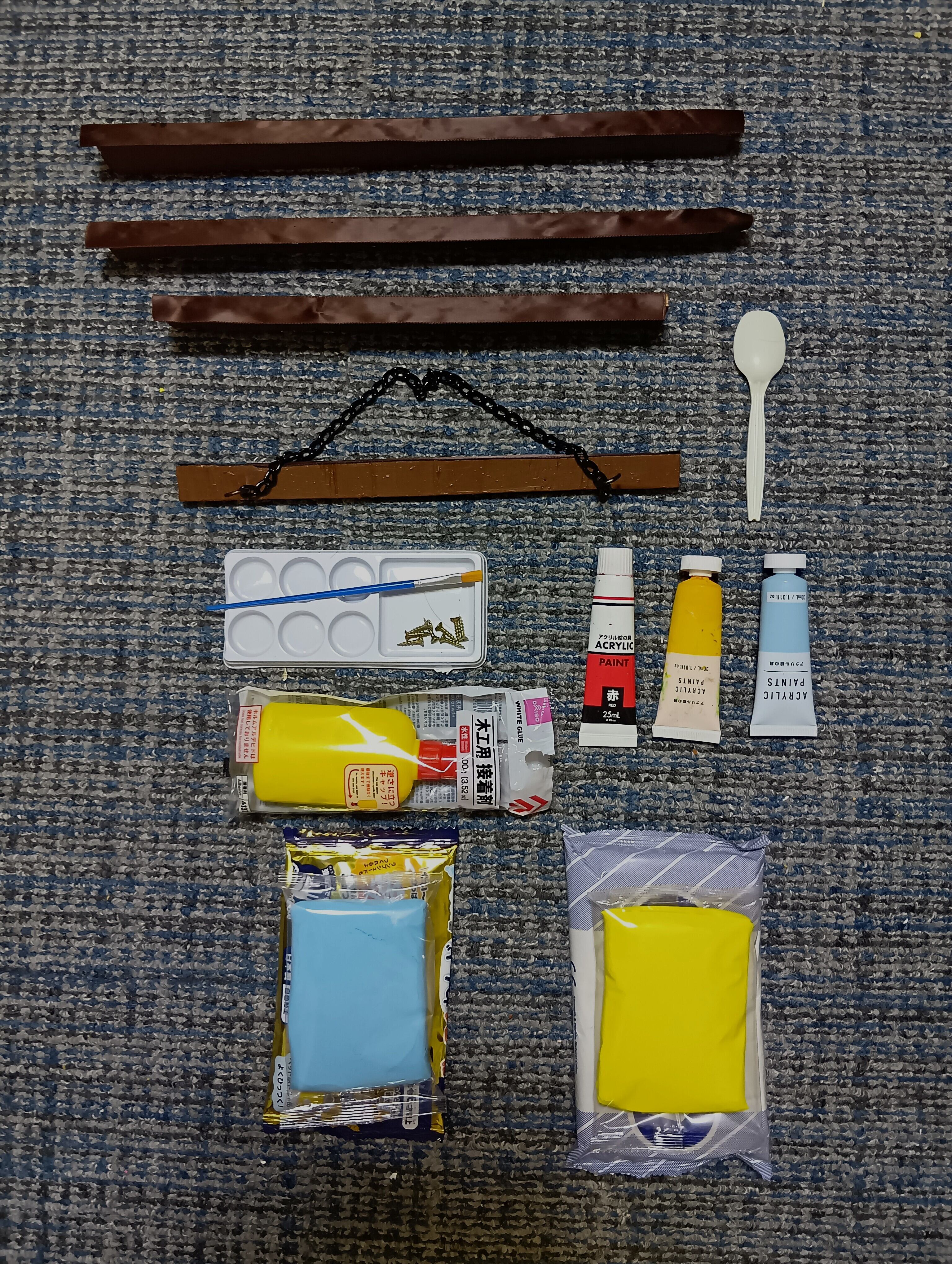 商品は、この絵画を誰でも簡単に作れる材料を送ります。2枚目写真の画板(立体下地材を設置)と、3枚目写真の材料(額縁4本、樹脂粘土の青と黄、アクリル絵の具の赤、黄、青の3つ、筆、パレット、ボンド、額縁止めネジと吊り下げ鎖、説明書)を送ります。説明書を読んで1、2日で、「浜辺の朝日」が完成です。