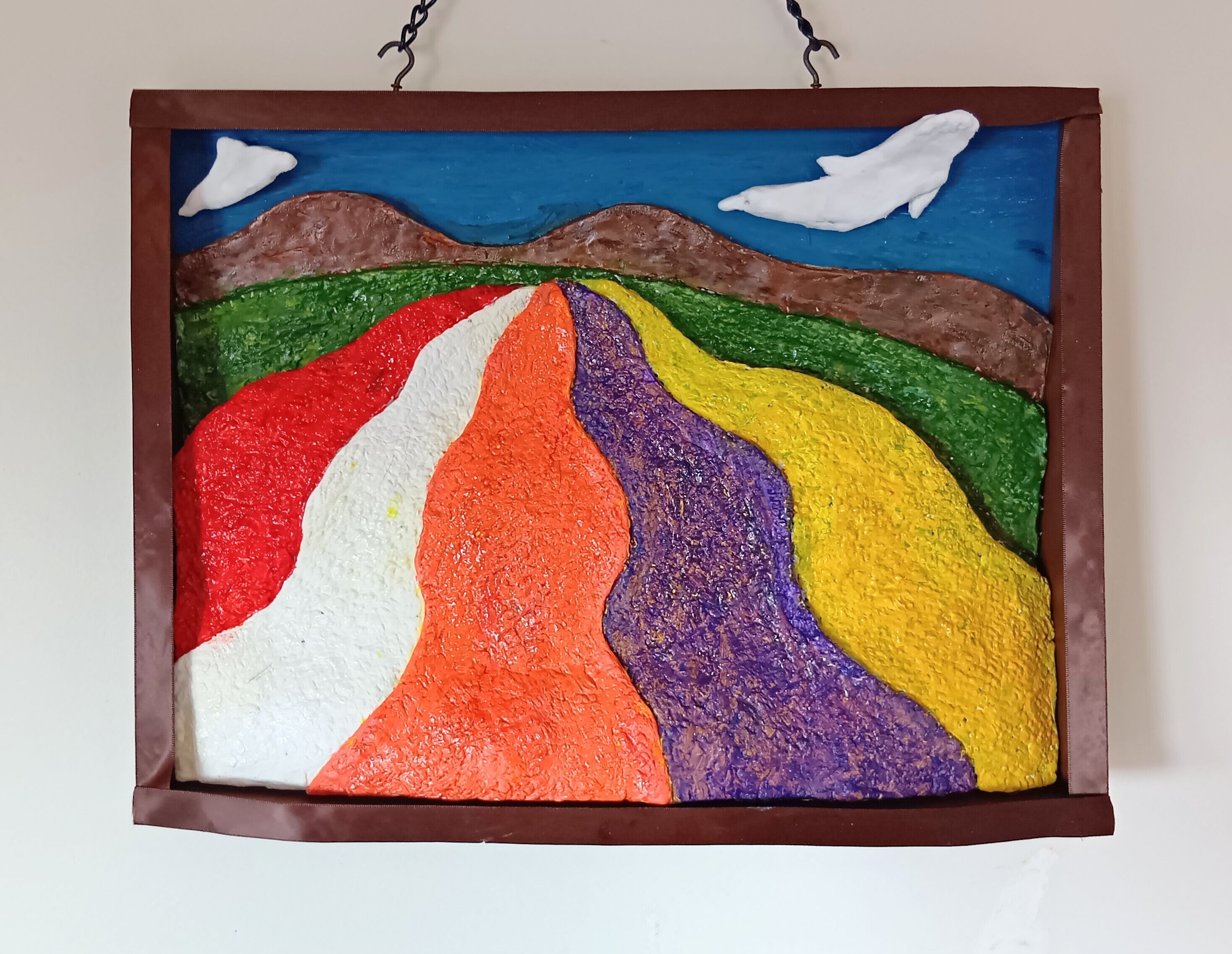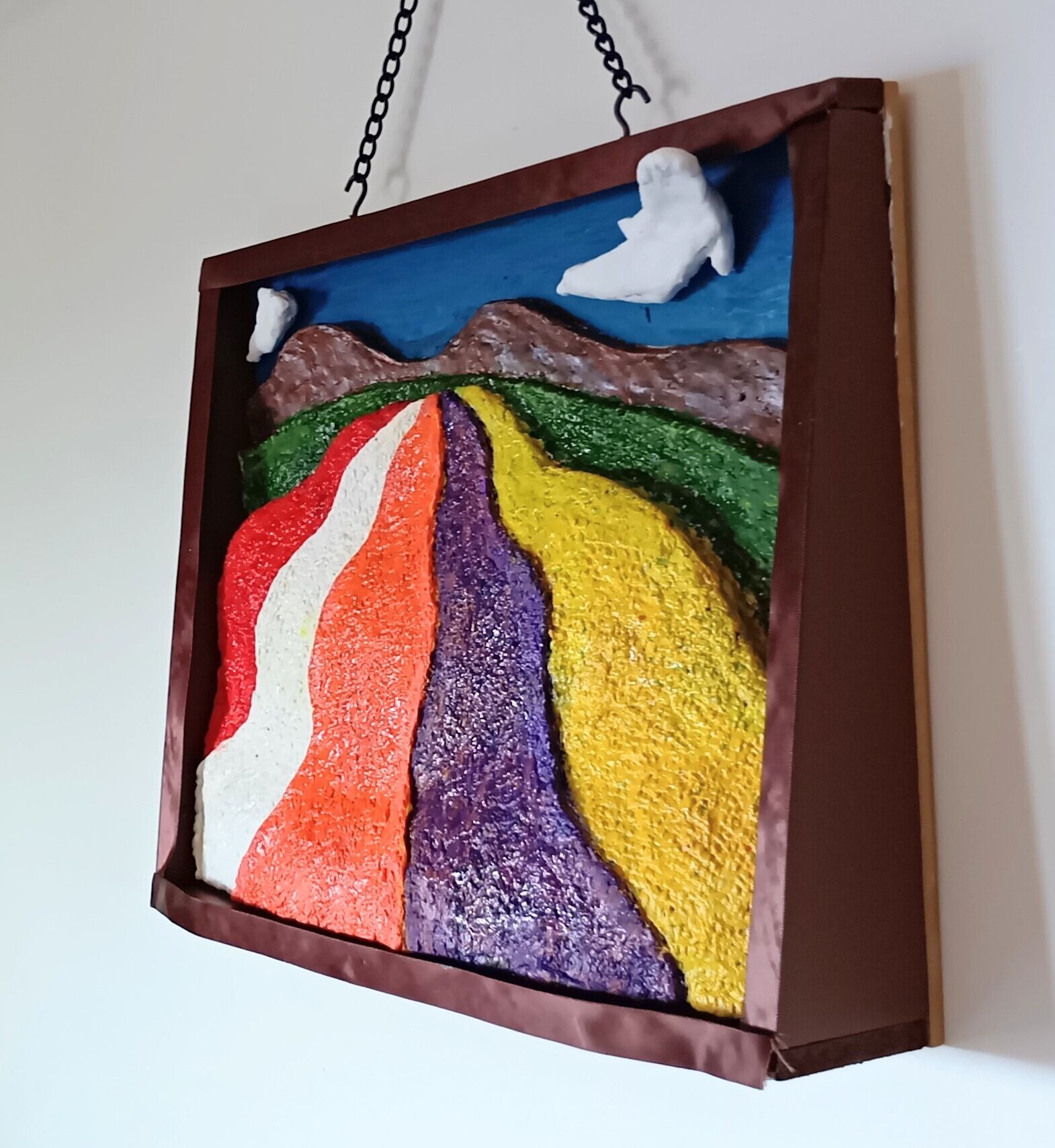 絵画の[山並]や[森]、起伏のある[ラベンダー畑]は立体下地まで出来てます。あとは貴方が①下地の上に樹脂粘土を伸ばして、森とラベンダーはスタンピングして整形して下さい。そしてその上に、②3つの絵の具を混ぜてサンプルのように絵付けして下さい。サンプル絵画1(1枚目の写真)や、雲を加えたサンプル絵画2(最後の2枚の写真)を参考に、サンプル以上に、貴方のもっと素晴らしい絵画を作って、自作の絵画を飾って下さい。
