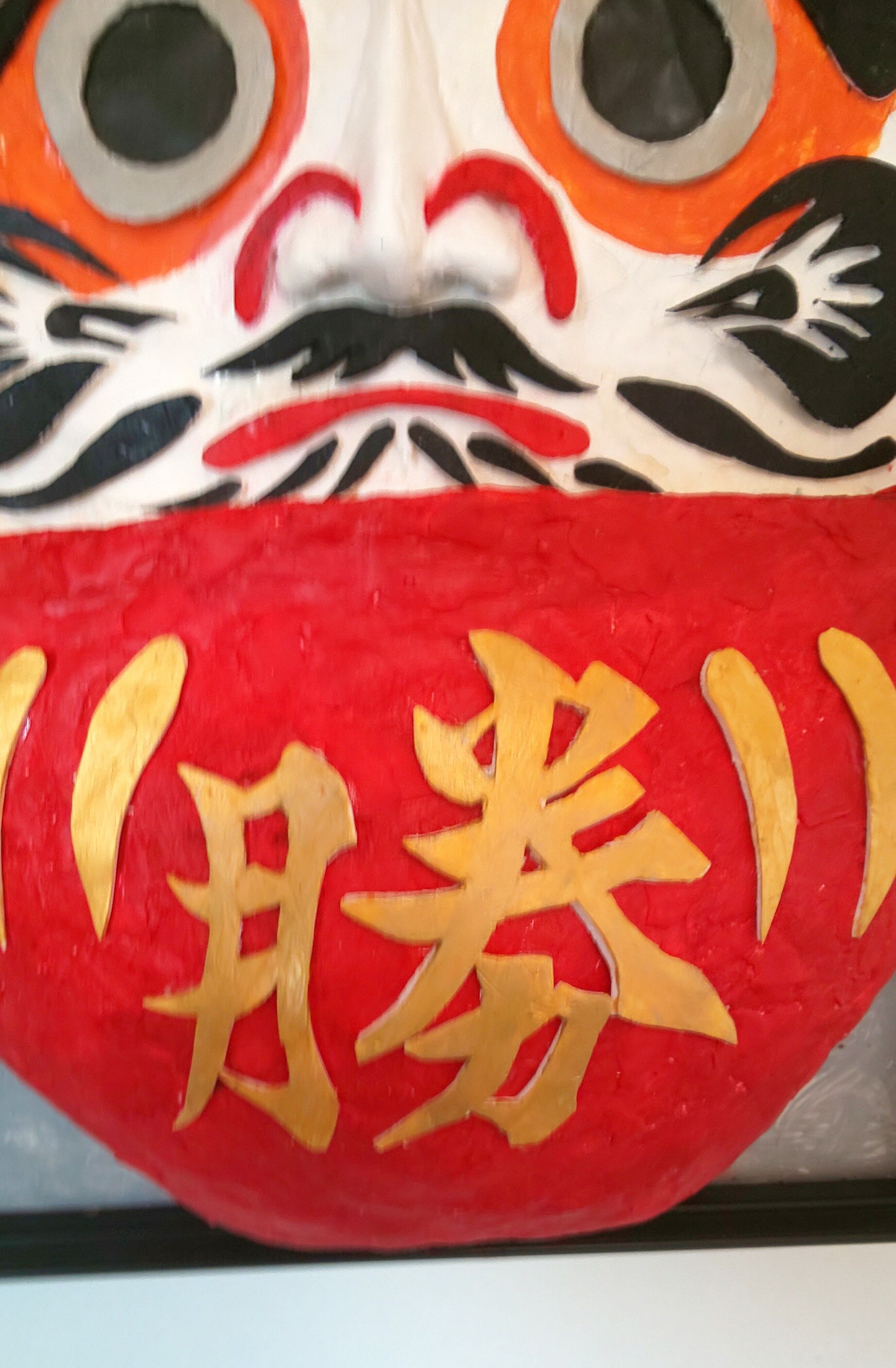 作品のダルマは筋の通った鼻を付けました。ダルマには鼻はありませんが、菩提達磨は昔の絵画から大きい団子鼻でした。作品の筋鼻を付けたダルマは眼光鋭く表情が引き締まり、祈願を真摯に受け取ってくれます。