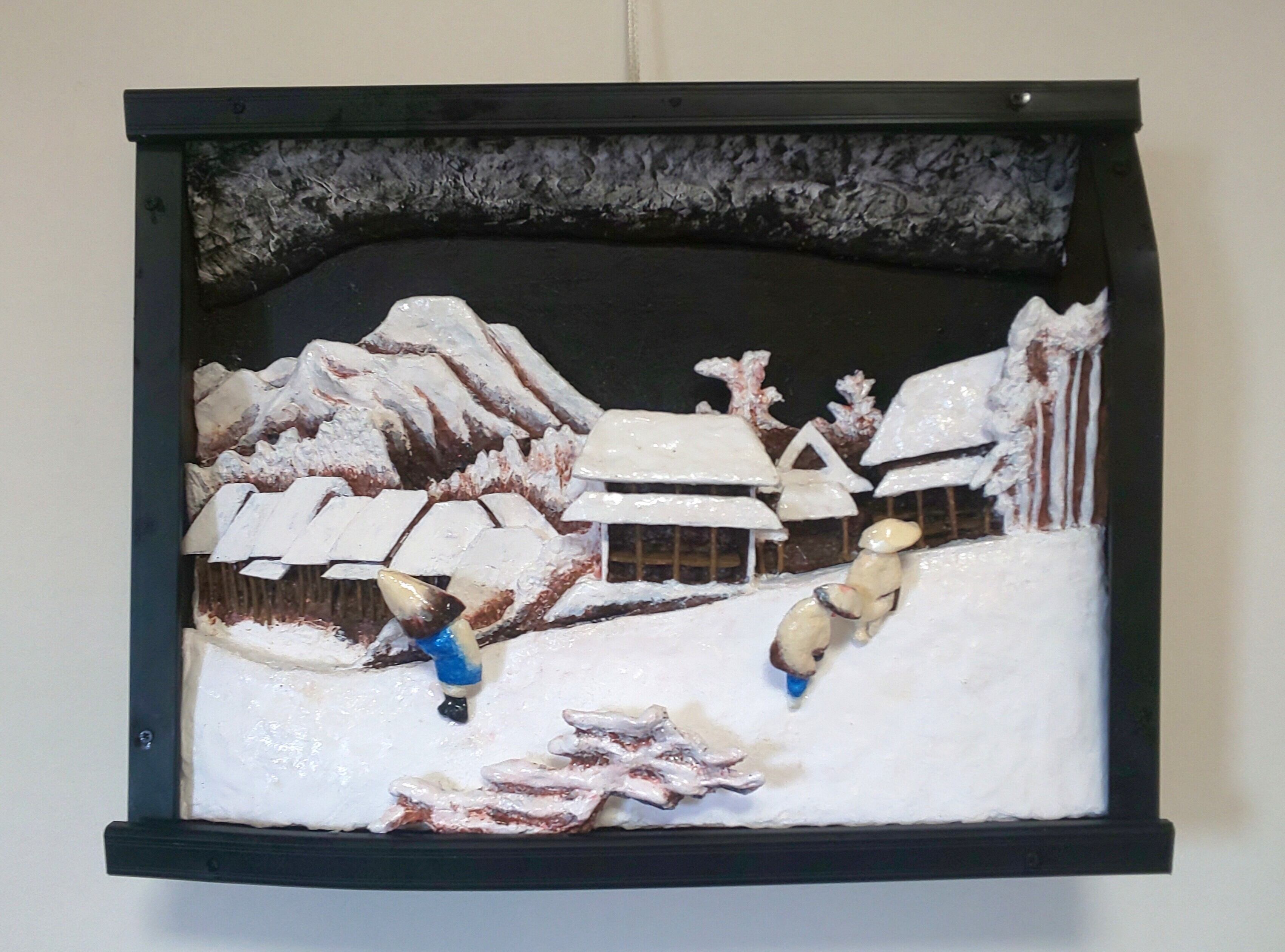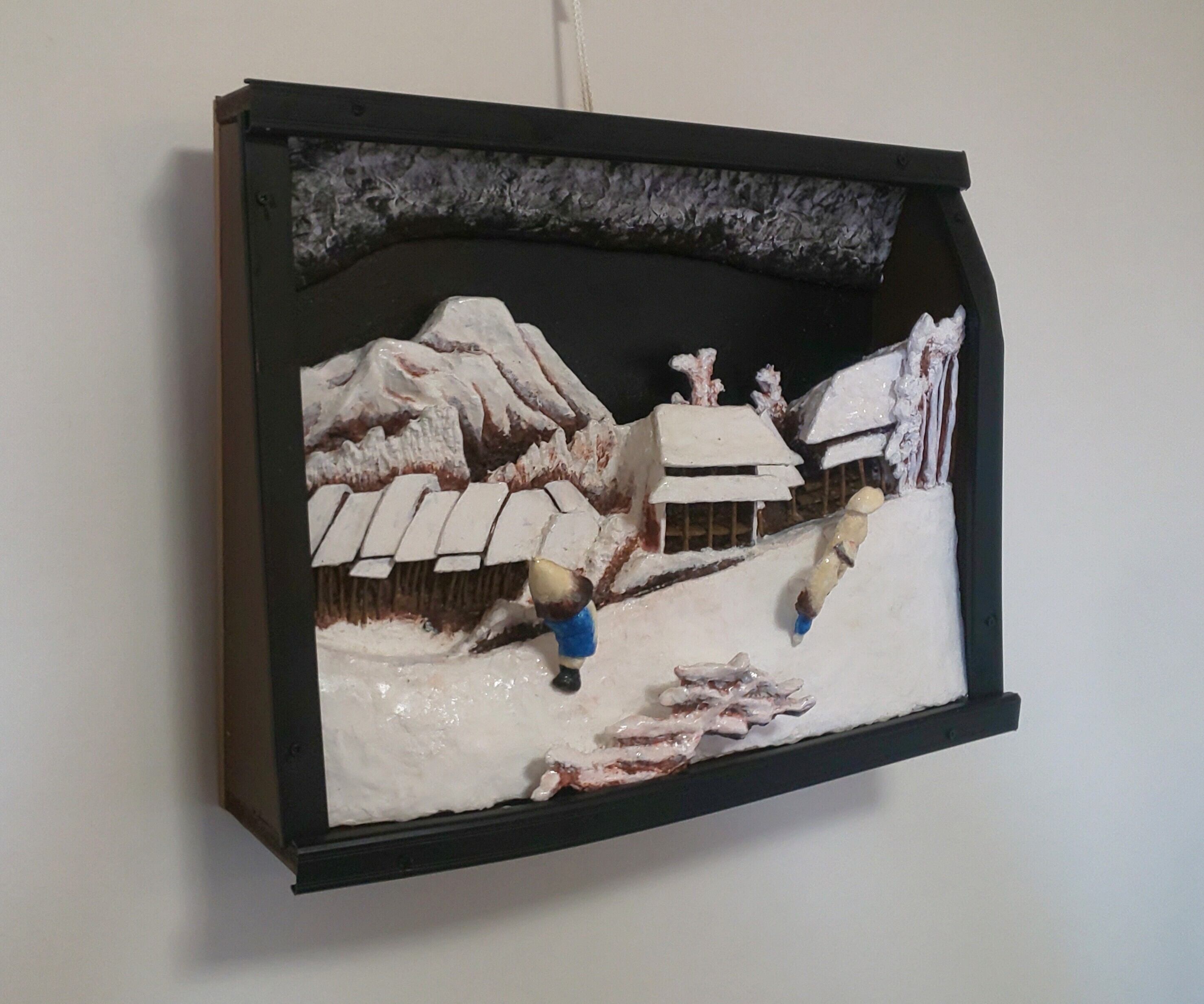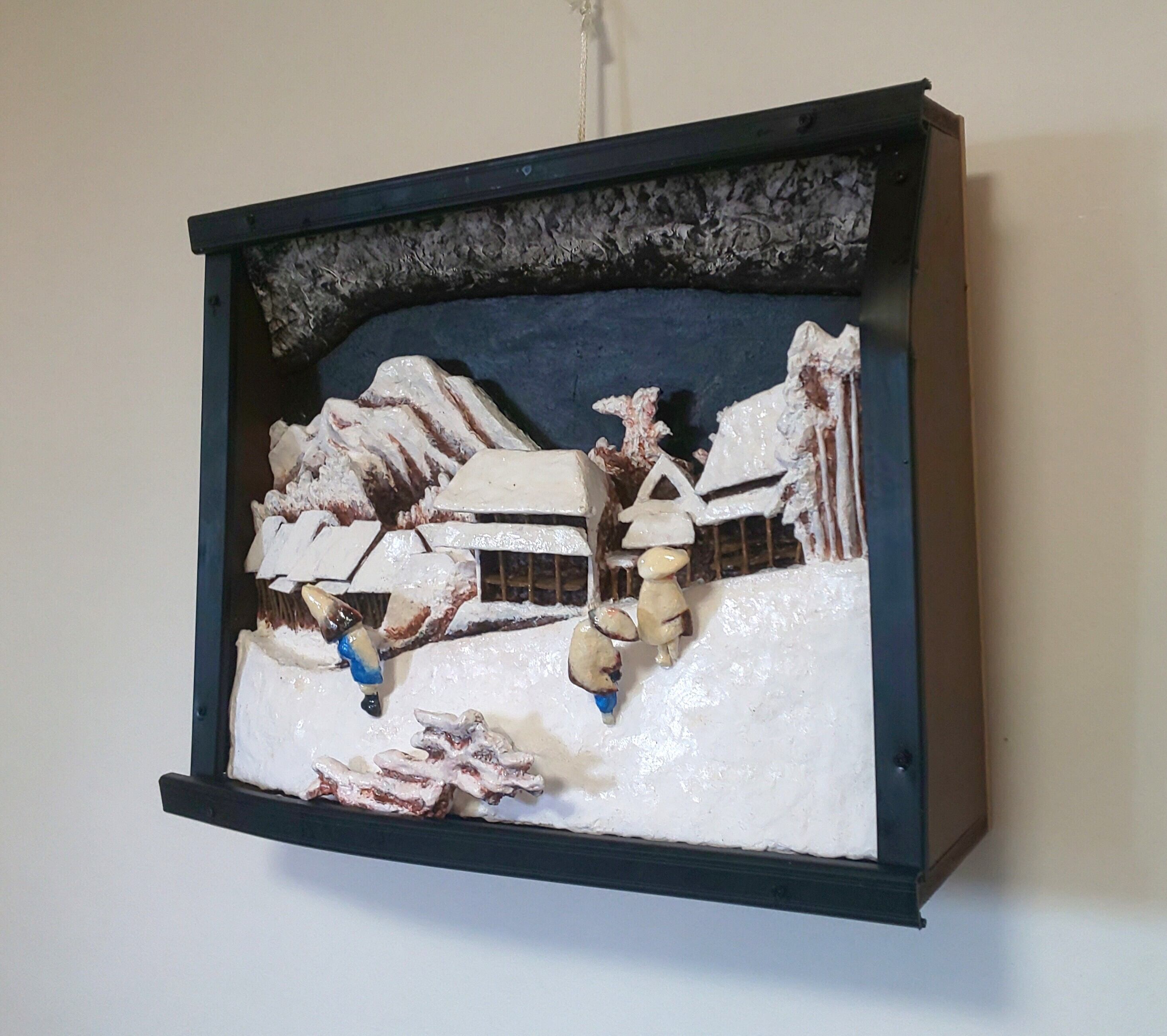 作品は、坂道が家並みまで曲がり下り、空は暗くて天空は雪明かりで霞んでます。材料の白い粘土の立体の厚みが、山々や家並み、降り積もる雪の実在感を表現。