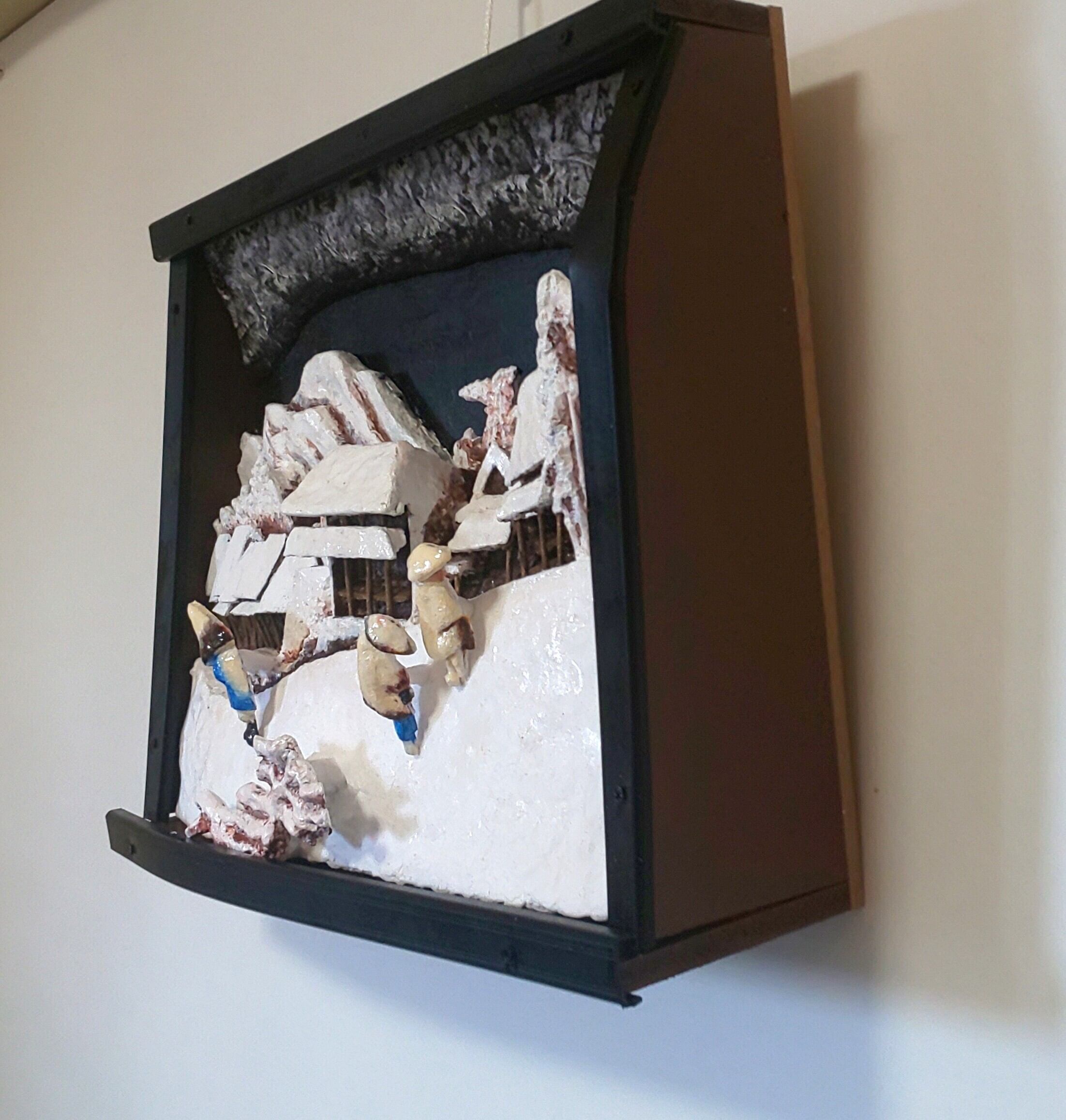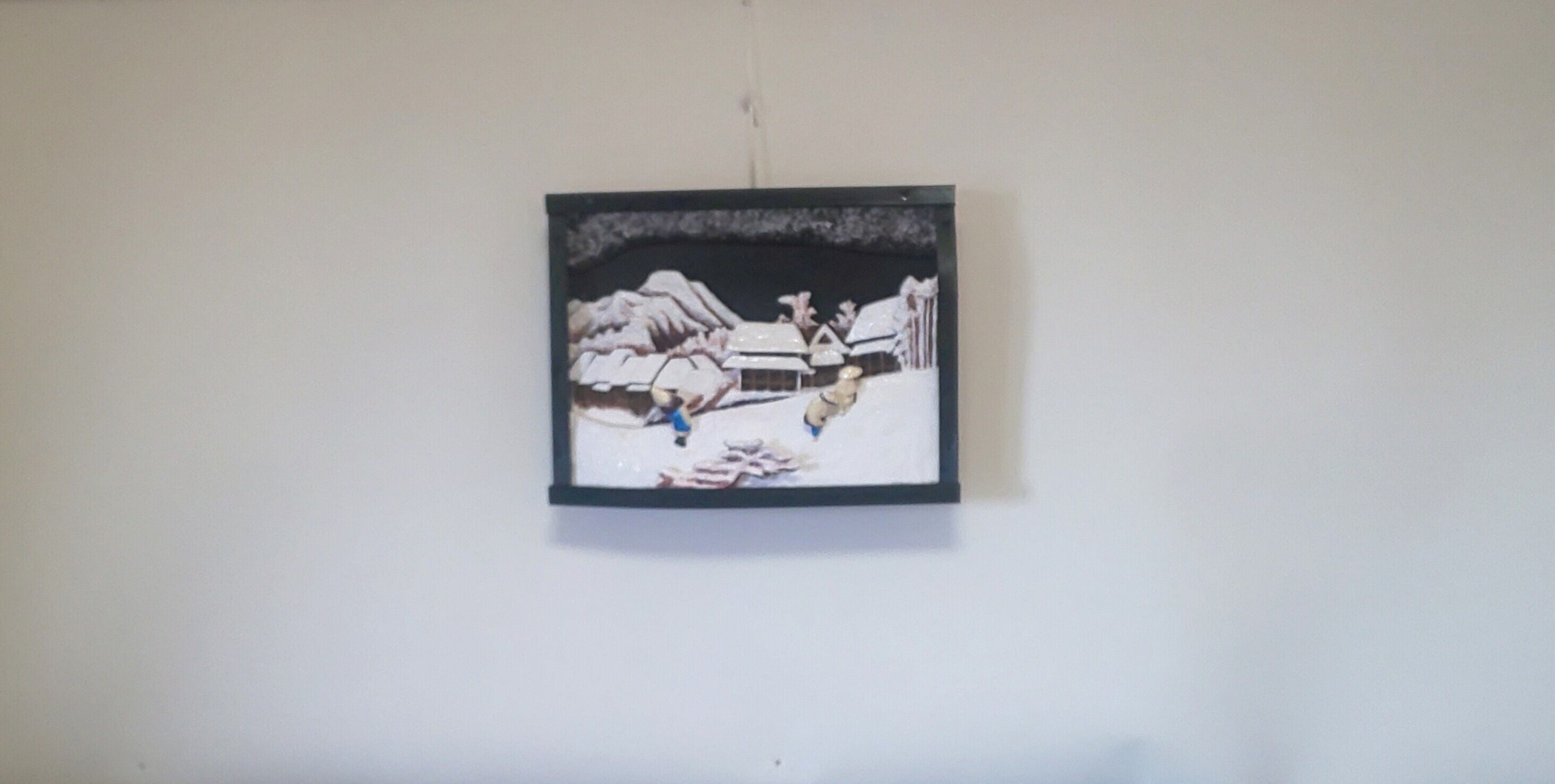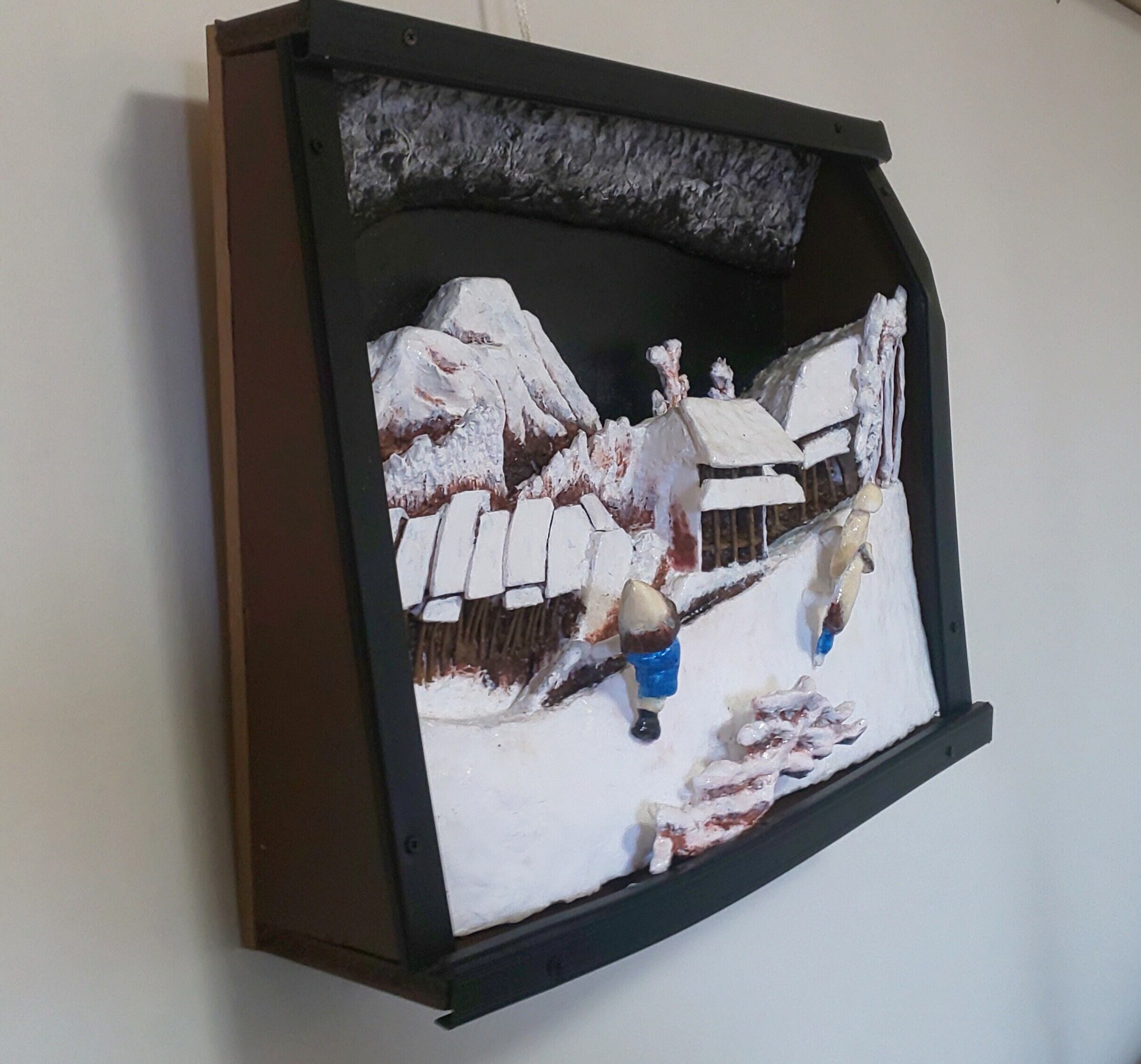 作品は、坂道が家並みまで曲がり下り、空は暗くて天空は雪明かりで霞んでます。材料の白い粘土の立体の厚みが、山々や家並み、降り積もる雪の実在感を表現。
