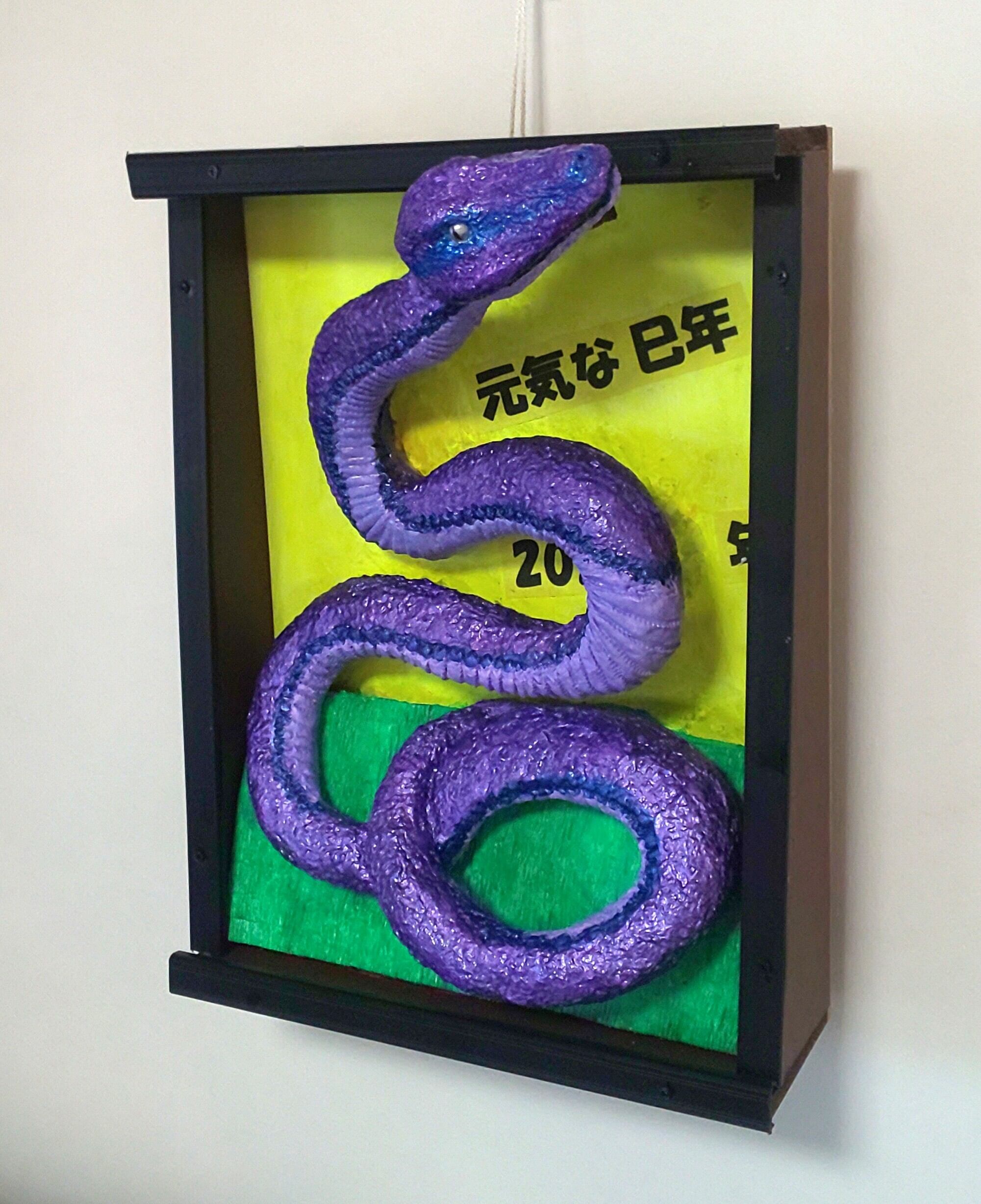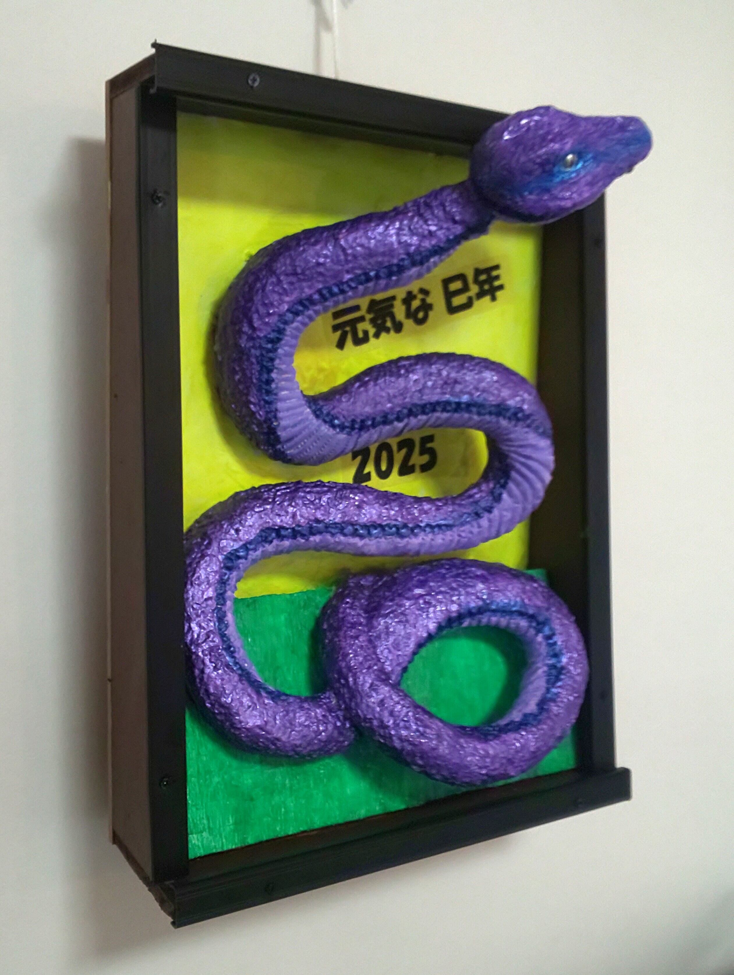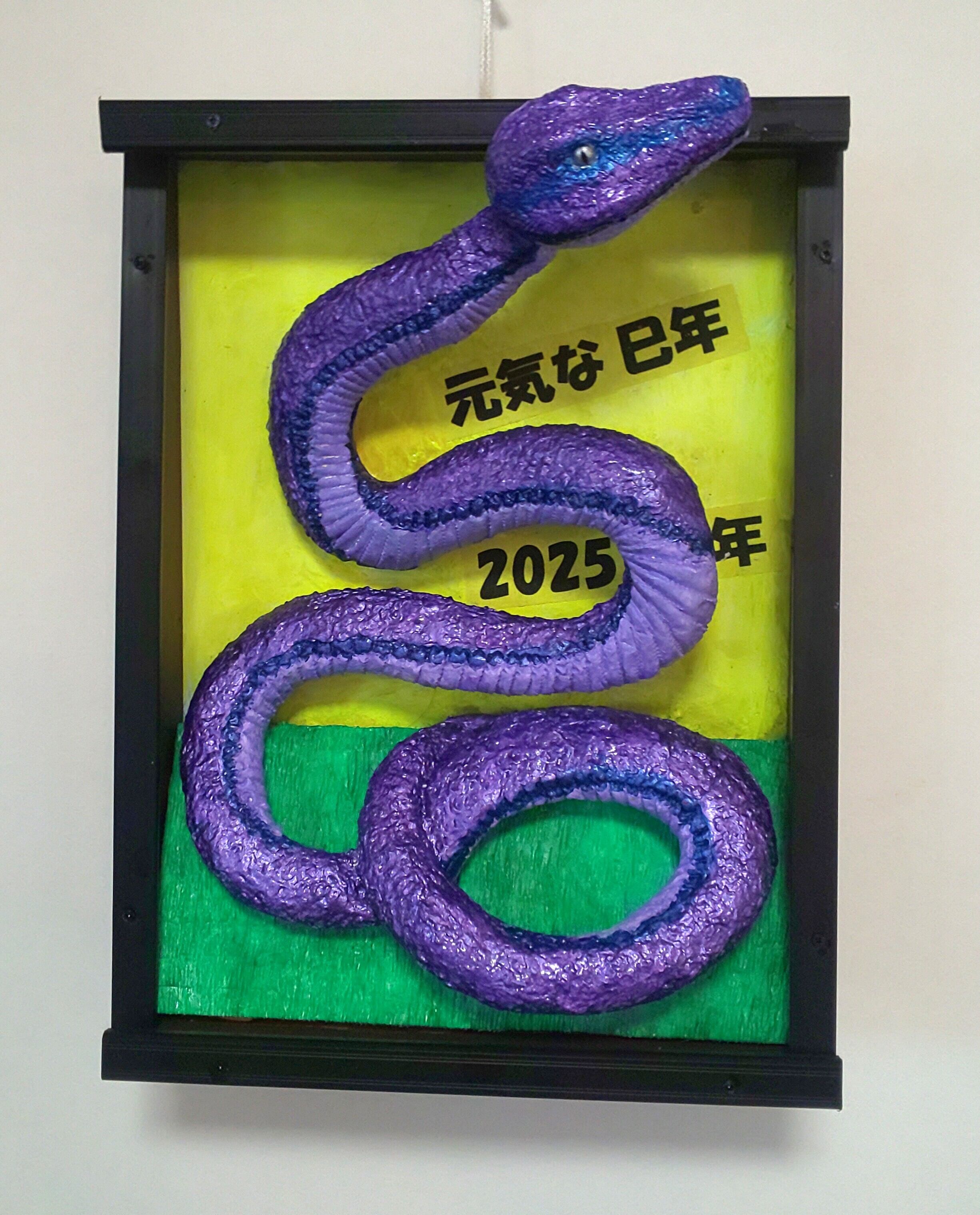 作品は、超突っ走った芝生から天に昇ろうとする、脂ぎる精力的な蛇。紫色は古代より皇帝や王家の色で活力の出る色。2025年も紫蛇のように元気で幸運の一年になります。