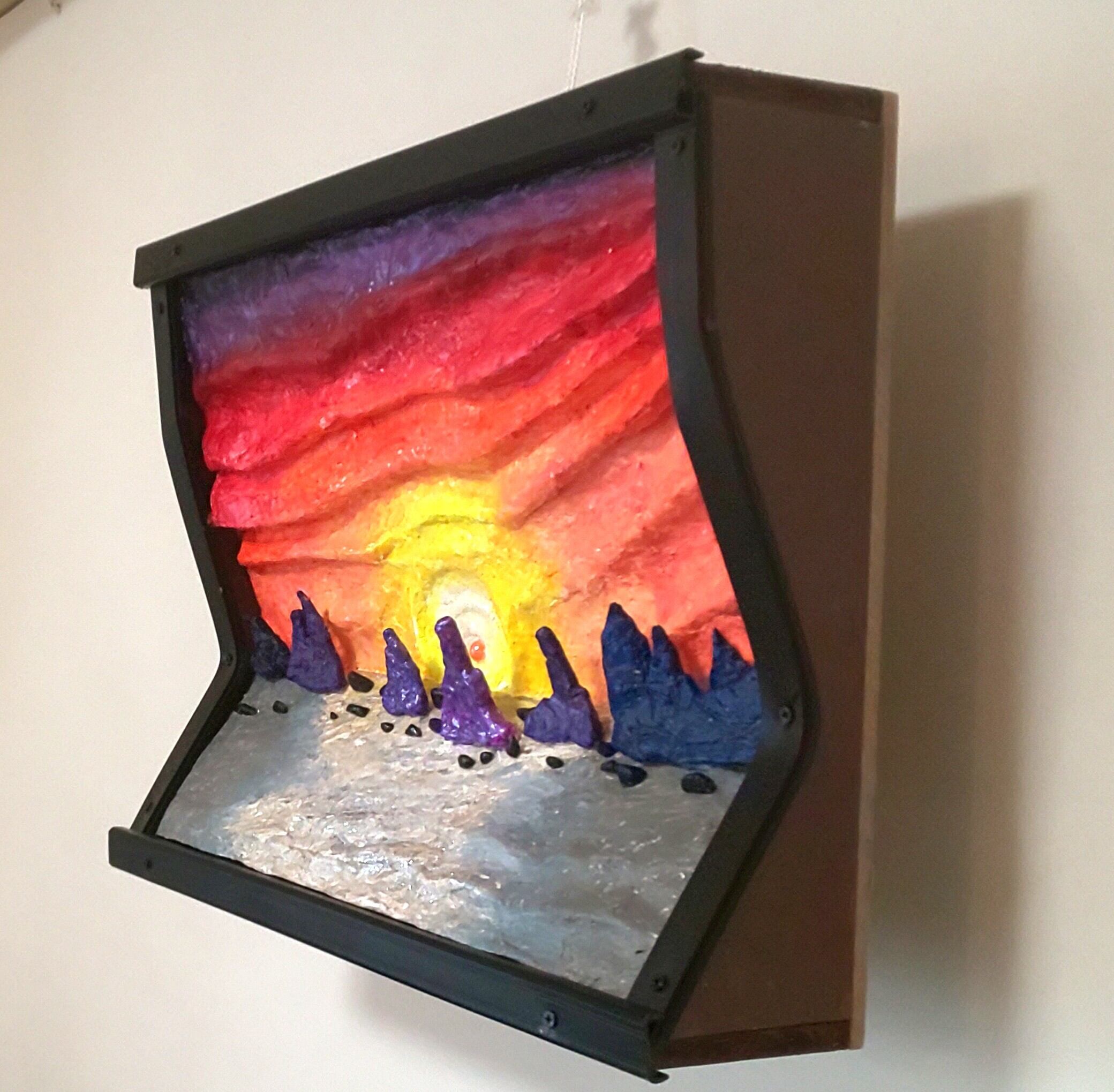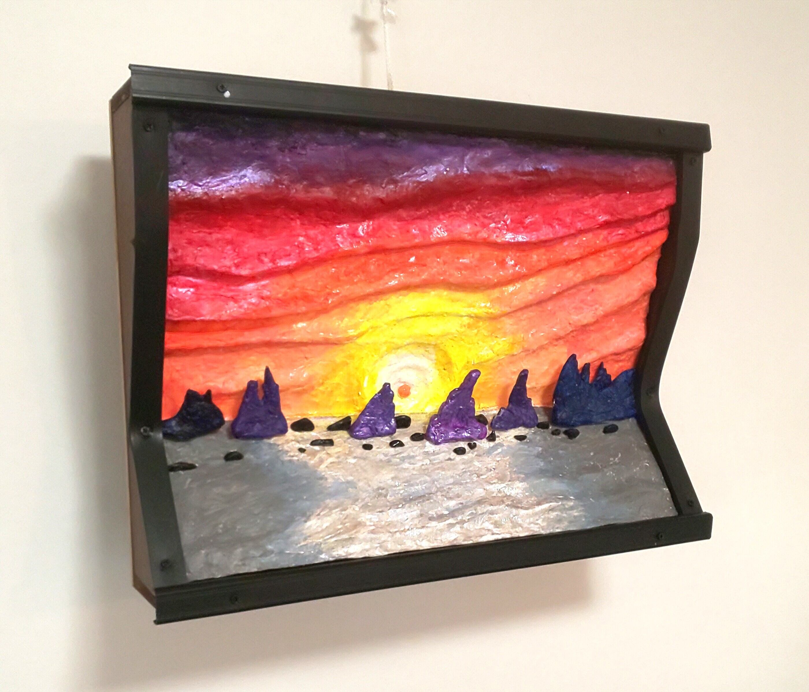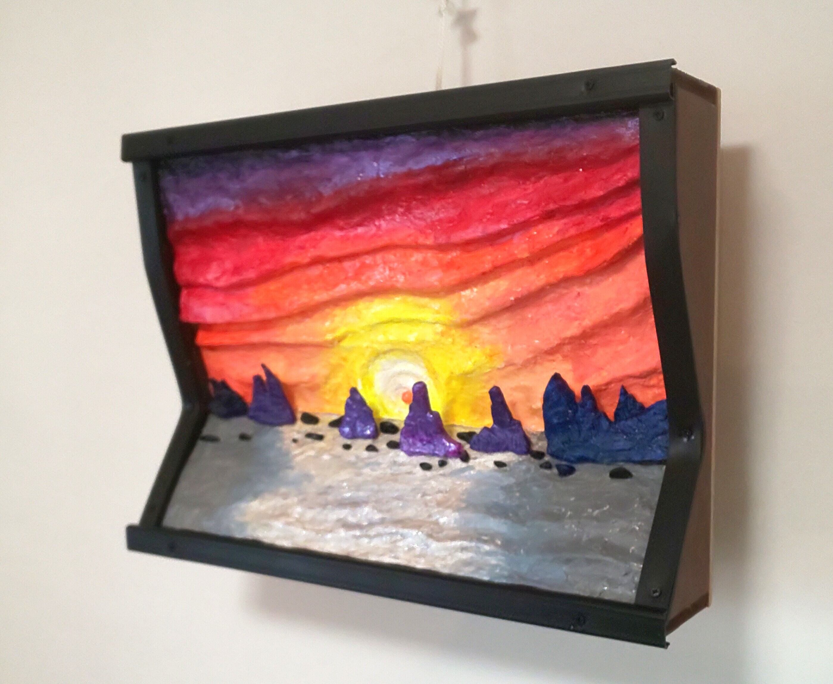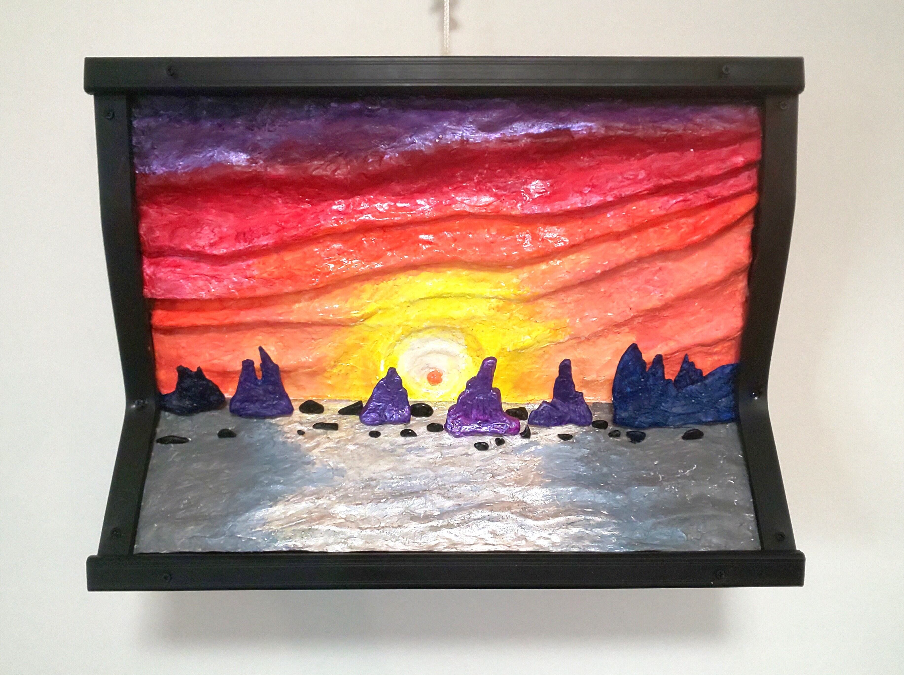 耐久性に優れた樹脂粘土を材料に整形研磨し、硬化と光沢の表面加工剤等で装飾した、未来3D粘土アートの立体絵画。